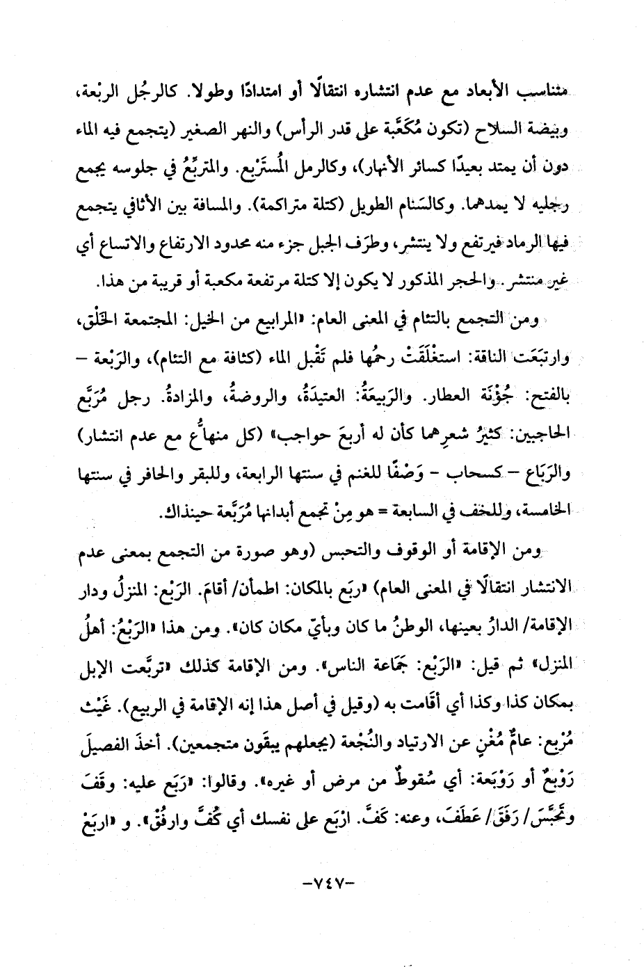 متناسب الأبعاد مع عدم انتشار انتقالًا او امتدادًا وطولا. كالرجُل الربْعة، وبيضة السلاح (تكون مُكَعَّبة على قدر الرأس) والنهر الصغير (يتجمع فيه الماء دون أن يمتد بعيدًا كسائر الأنهار)، وكالرمل المُستَرْبع. والمتربِّعُ في جلوسه يجمع رجليه لا يمدهما. وكالسَنام الطويل (كتلة متراكمة). والمسافة بين الأثافي يتجمع فيها الرماد فيرتفع ولا ينتشر، وطرَف الجبل جزء فه محدود الارتفاع والاتساع أي غير منتشر. والحجر المذكور لا يكون إلا كتلة مرتفعة مكعبة أو قريبة من هذا.