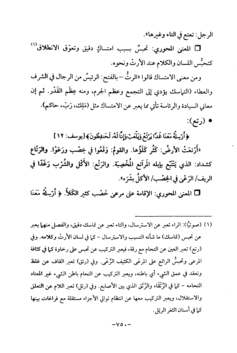 (¬1) (صوتيًّا): الراء تعبر عن الاسترسال، والتاء تعبر عن تماسك دقيق، والفصل منهما يعبر عن تحبس (تماسك) ما شأنه التسيب والاسترسال -كما في لسان الأرتّ وكلامه -وفي (رتع) تعبر العين عن التحام مع رقة، فيعبر التركيب عن تحبس على رخاوة كما في كثافة المرعى وتحبسُّ الراتع على المرعَى الكثيف الرِّعْى. وفي (رتق) تعبر القاف عن غلظ وتعقد في عمق الشيء أي باطنه، ويعبر التركيب عن التحام باطن الشيء غير المعتاد التحامه -كما في الرَّتْقَاء والرَّتَق الذي بين الأصابع. وفي (رتل) تعبر اللام عن التعلق والاستقلال، ويعبر التركيب معها عن انتظام توالي الأجزاء مستقلة مع فراغات بنيها كما في أسنان الثغر الرتِل.