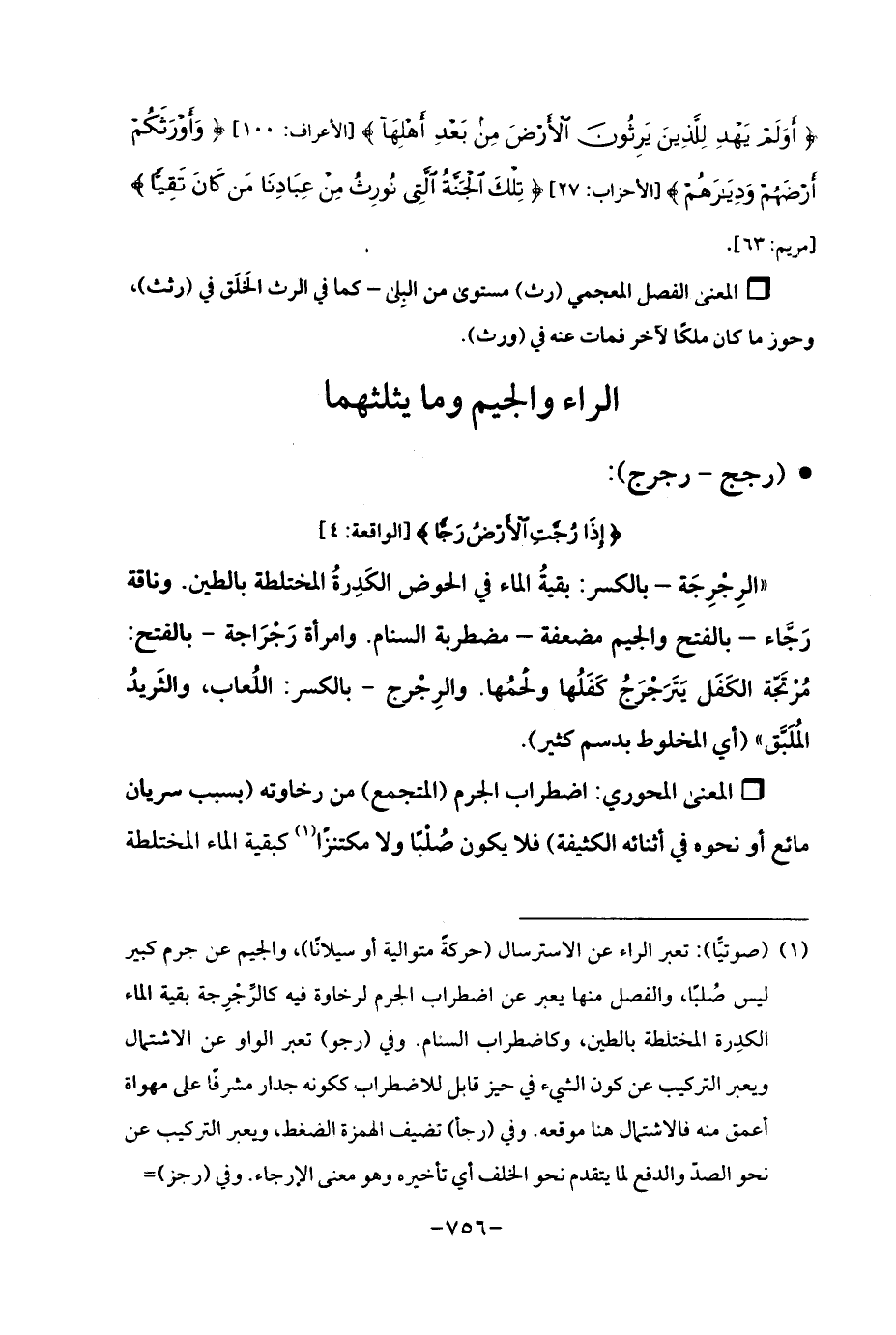 (¬1) (صوتيًّا): تعبر الراء عن الاسترسال (حركةً متوالية أو سيلانًا)، والجيم عن جرم كبير ليس صُلبًا، والفصل منها يعبر عن اضطراب الجرم لرخاوة فيه كالرِّجْرِجة بقية الماء الكدِرة المختلطة بالطين، وكاضطراب السنام. وفي (رجو) تعبر الواو عن الاشتمال ويعبر التركيب عن كون الشيء في حيز قابل للاضطراب ككونه جدار مشرفًا على مهواة أعمق منه فالاشتمال هنا موقعه. وفي (رجأ) تضيف الهمزة الضغط، ويعبر التركيب عن نحو الصدّ والدفع لما يتقدم نحو الخلف أي تأخيره وهو معنى الإرجاء. وفي (رجز) =