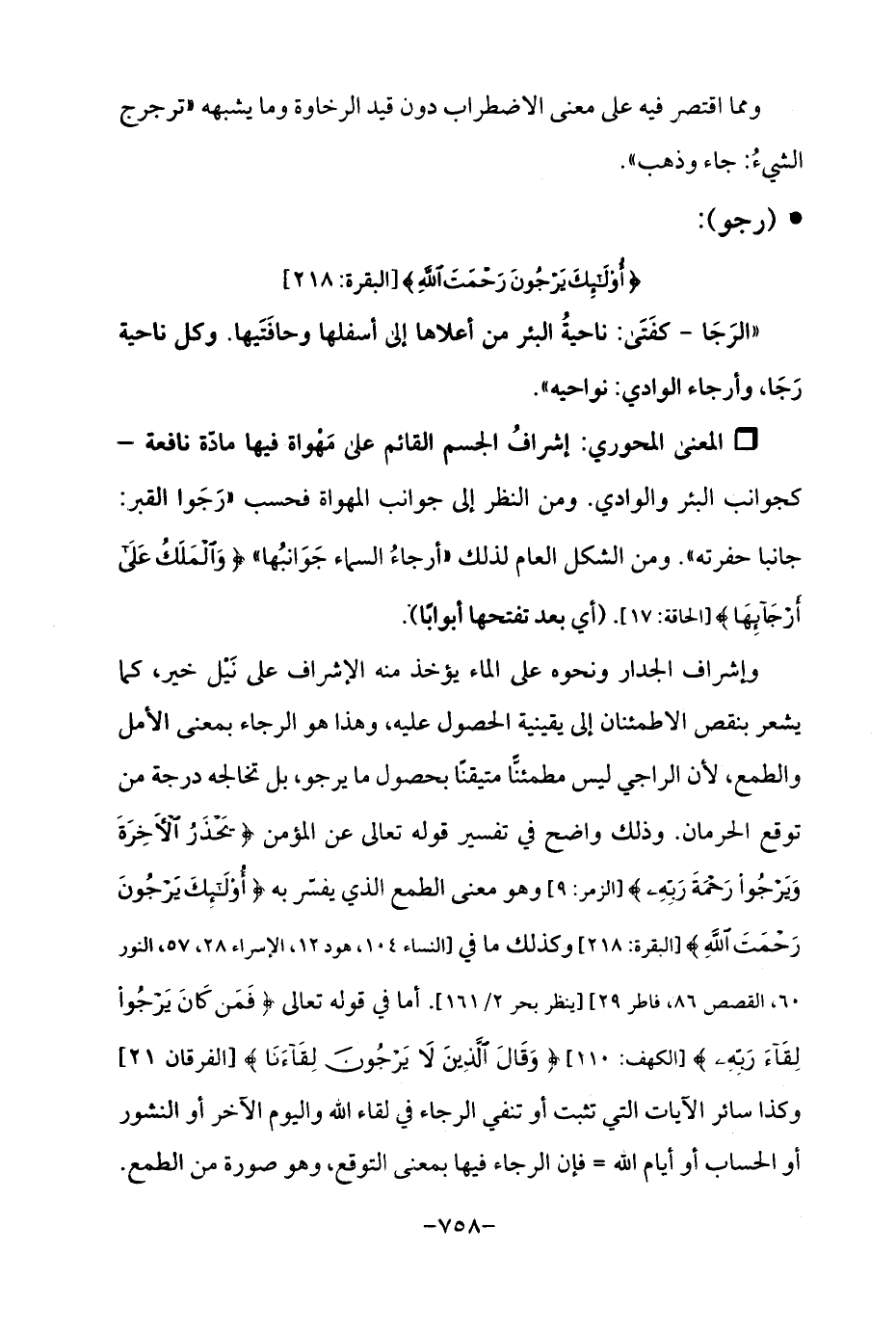 وإشراف الجدار ونحوه على الماء يؤخذ منه الإشراف عل نَيْل خير، كما يشعر بنقص الاطمئنان إلى يقينية الحصول عليه، وهذا هو الرجاء بمعنى الأمل والطمع، لأن الراجي ليس مطمئنًّا متيقنًا بحصول ما يرجو، بل تخالجه درجة من توقع الحرمان. وذلك واضح في تفسير قوله تعالى عن المؤمن {يَحْذَرُ الْآخِرَةَ وَيَرْجُو رَحْمَةَ رَبِّهِ} [الزمر: 9] وهو معنى الطمع الذي يفسّر به {أُولَئِكَ يَرْجُونَ رَحْمَتَ اللَّهِ} [البقرة: 218] وكذلك ما في [النساء 104، هود 12، الإسراء 28، 57، النور 60، القصص 86، فاطر 29] [ينظر بحر 2/ 161] أما في قوله تعالى {فَمَنْ كَانَ يَرْجُو لِقَاءَ رَبِّهِ} [الكهف: 110] {وَقَالَ الَّذِينَ لَا يَرْجُونَ لِقَاءَنَا} [الفرقان 21] وكذا سائر الآيات التي تثبت أو تنفي الرجاء في لقاء الله واليوم الآخر أو النشور أو الحساب أو أيام الله = فإن الرجاء فيها بمعنى التوقع، وهو صورة من الطمع.