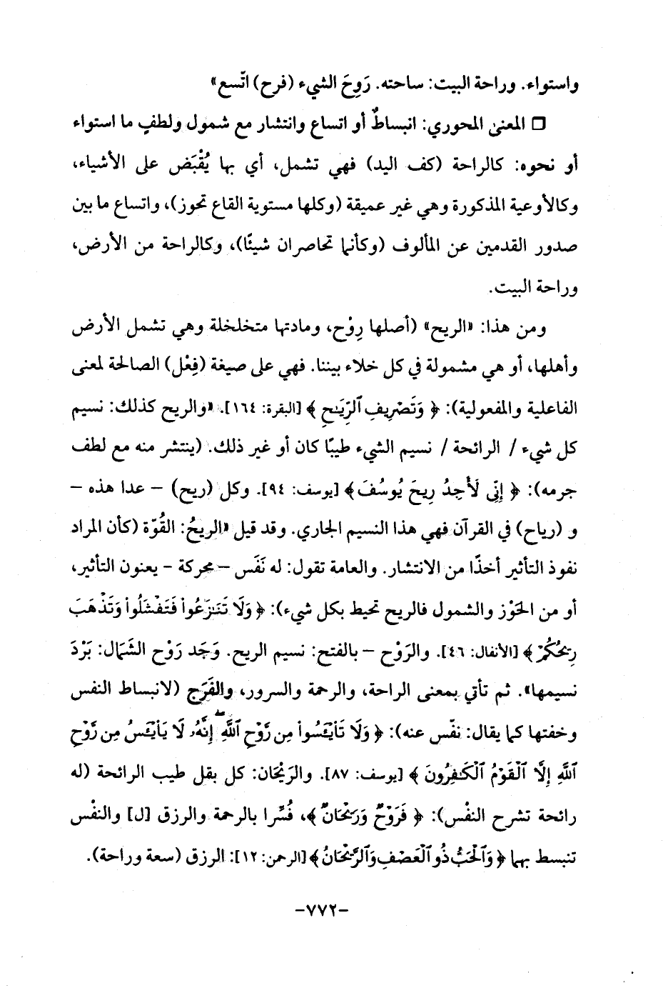 ومن هذا: "الريح " (أصلها رِوْح، ومادتها متخلخلة وهي تشمل الأرض وأهلها، أو هي مشمولة في كل خلاء بيننا. فهي على صيغة (فِعْل): الصالحة لمعنى الفاعلية والمفعولية): {وَتَصْرِيفِ الرِّيَاحِ} [البقرة: 164]. "والريح كذلك: نسيم كل شيء/ الرائحة/ نسيم الشيء طيبًا كان أو غير ذلك. (ينتشر منه مع لطف جرمه): {إِنِّي لَأَجِدُ رِيحَ يُوسُفَ} [يوسف: 94]. وكل (ريح) -عدا هذه- و (رياح) في القرآن فهي هذا النسيم الجاري. وقد قيل "الريحُ: القُوّة (كأن المراد نفوذ التأثير أخذًا من الانتشار. والعامة تقول: له نَفَس -محركة- يعنون التأثير، أو من الحَوْز والشمول فالريح تحيط بكل شيء): {وَلَا تَنَازَعُوا فَتَفْشَلُوا وَتَذْهَبَ رِيحُكُمْ} [الأنفال: 46]. والرَوْح -بالفتح: نسيم الريح. وَجَد رَوْح الشَمَال: بَرْدَ نسيمها ". ثم تأتي بمعنى الراحة، والرحمة والسرور، والفَرَج (لانبساط النفس وخفتها كما يقال: نفّس عنه): {وَلَا تَيْأَسُوا مِنْ رَوْحِ اللَّهِ إِنَّهُ لَا يَيْأَسُ مِنْ رَوْحِ اللَّهِ إِلَّا الْقَوْمُ الْكَافِرُونَ} [يوسف: 87]. والريْحَان: كل بقل طيب الرائحة (له رائحة تشرح النفْس): {فَرَوْحٌ وَرَيْحَانٌ}، فُسِّرا بالرحمة والرزق [ل] والنفْس تنبسط بهما {وَالْحَبُّ ذُو الْعَصْفِ وَالرَّيْحَانُ} [الرحمن: 12]: الرزق (سعة وراحة).