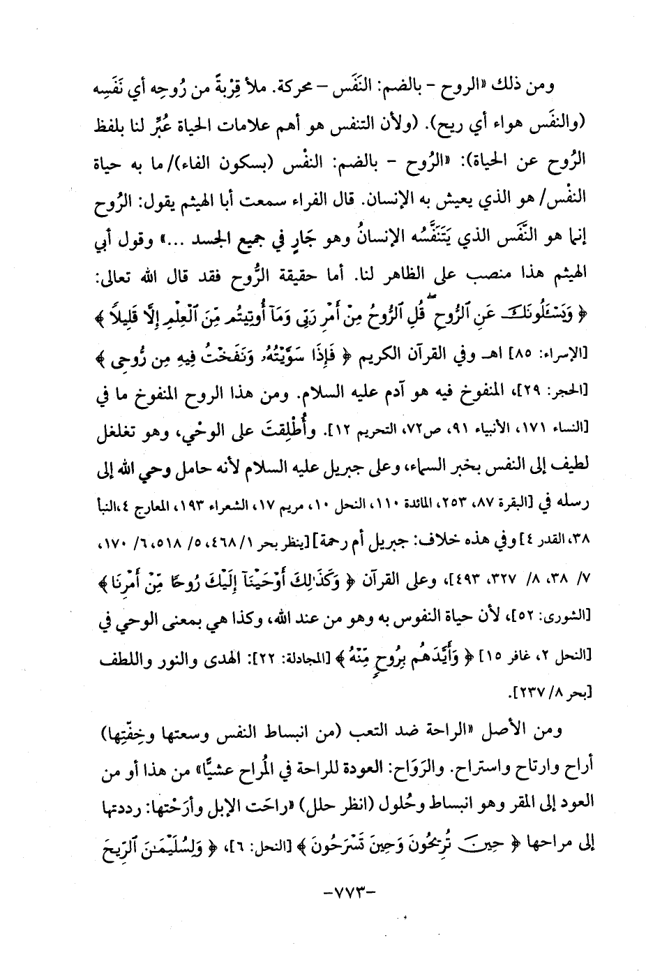 ومن ذلك "الروح -بالضم: النَفَس- محركة. ملأ قِرْبةً من رُوحِه أي نَفَسِه (والنفَس هواء أي ريح). (ولأن التنفس هو أهم علامات الحياة عُبِّر لنا بلفظ الرُوح عن الحياة): "الرُوح -بالضم: النفْس (بسكون الفاء) ما به حياة النفْس/ هو الذي يعيش به الإنسان. قال الفراء سمعت أبا الهيثم يقول: الرُوح إنما هو النَّفَس الذي يَتَنَفَّسُه الإنسانُ وهو جَارٍ في جميع الجسد ... "وقول أبي الهيثم هذا منصب على الظاهر لنا. أما حقيقة الرُّوح فقد قال الله تعالى: {وَيَسْأَلُونَكَ عَنِ الرُّوحِ قُلِ الرُّوحُ مِنْ أَمْرِ رَبِّي وَمَا أُوتِيتُمْ مِنَ الْعِلْمِ إِلَّا قَلِيلًا} [الإسراء: 85] اه وفي القرآن الكريم {فَإِذَا سَوَّيْتُهُ وَنَفَخْتُ فِيهِ مِنْ رُوحِي} [الحجر: 29]، المنفوخ فيه هو آدم عليه السلام. ومن هذا الروح المنفوخ ما في [النساء 171، الأنبياء 91، ص 72، التحريم 12]. وأُطْلِقتَ على الوحْي، وهو تغلغل لطيف إلى النفس بخبر السماء، وعلى جبريل عليه السلام لأنه حامل وحي الله إلى رسله في [البقرة 87، 253، المائدة 110، النحل 10، مريم 17، الشعراء 193، المعارج 4، النبأ 38، القدر 4] وفي هذه خلاف: جبريل أم رحمة] [ينظر بحر 1/ 468، 5/ 518، 6/ 170، 7/ 38، 8/ 327، 493]، وعلى القرآن {وَكَذَلِكَ أَوْحَيْنَا إِلَيْكَ رُوحًا مِنْ أَمْرِنَا} [الشورى: 52]، لأن حياة النفوس به وهو من عند الله، وكذا هي بمعنى الوحي في [النحل 2، غافر 15] {وَأَيَّدَهُمْ بِرُوحٍ مِنْهُ} [المجادلة: 22]: الهدى والنور واللطف [بحر 8/ 237].
