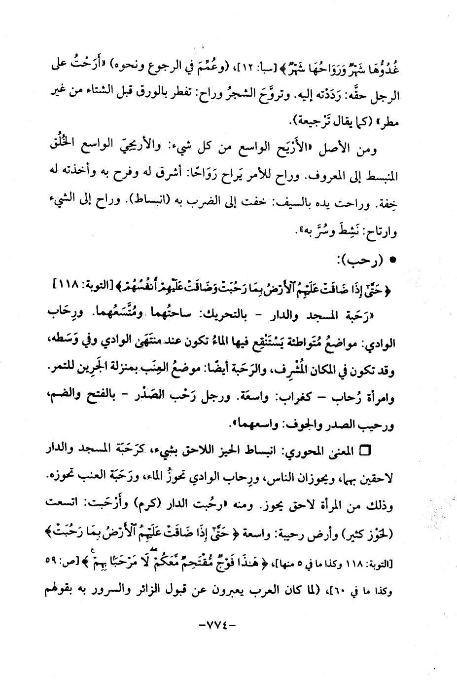 غُدُوُّهَا شَهْرٌ وَرَوَاحُهَا شَهْرٌ} [سبأ: 12]، (وعُمِّمَ في الرجوع ونحوه) "أَرَحْتُ على الرجل حقَّه: رَدَدْته إليه. وتروَّحَ الشجرُ وراح: تفطر بالورق قبل الشتاء من غير مطر " (كما يقال تَرْجيعة).