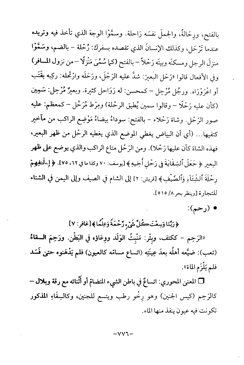 بالفتح، ورِحَالةً، والجملَ نفسَه رَاحلة. وسمَّوْا الوجهَ الذي تأخذ فيه وتريده عندما تَرْحَل، وكذلك الإنسانَ الذي تقصده بسفرك: رُحْلة -بالضم، وسَمَّوْا منزلَ الرجل ومسكنَه وبيتَه رَحْلًا -بالفتح (كما سُمِّىَ مَنْزلًا- من نزول المسافر) وفي الأفعال قالوا "رَحَل البعيرَ: شدَّ عليه الرَجْلَ، ورَحَلَه وارْتَحله: ركِبه بقَتَب أو اعْرَوْرَاه. ورجُل مُرْحِل -كمحسن: له رَوَاحل كثيرة. وبعيرٌ مُرْحِل: سَمِين (كأن عليه رَحْلًا - وقالوا سمين يُطيق الرحْلة) ومِرْط مُرَحَّل -كمعظم: عليه صور الرَحْل. وشاة رَحْلاء -بالفتح: سوداءُ بيضاءُ مَوْضِع الراكب من مآخير كتفيها ... (أي أن البياض يغطي الموضع الذي يغطيه الرحْل من ظهر البعير، فهذه الشاة كأن عليها رَحْلا). ومن الرَحْل متاع الراكب والذي يوضع على ظهر البعير {جَعَلَ السِّقَايَةَ فِي رَحْلِ أَخِيهِ} [يوسف: 70 وكذا ما في 62، 75]. {إِيلَافِهِمْ رِحْلَةَ الشِّتَاءِ وَالصَّيْفِ} [قريش: 2] إلى الشام في الصيف وإلى اليمن في الشتاء للتجارة [وينظر بحر 8/ 515].