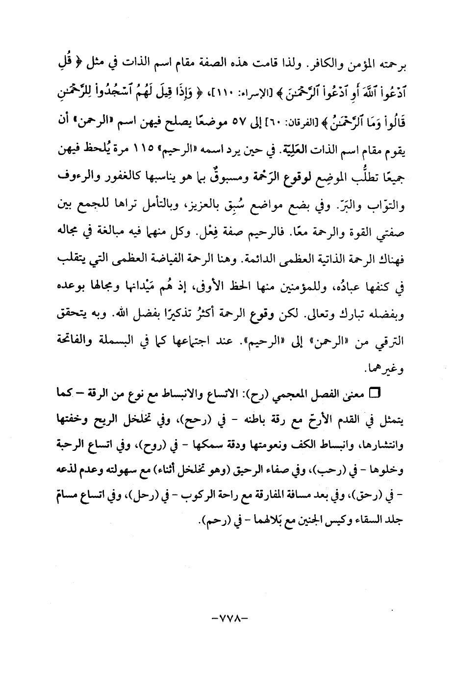 برحمته المؤمن والكافر. ولذا قامت هذه الصفة مقام اسم الذات في مثل {قُلِ ادْعُوا اللَّهَ أَوِ ادْعُوا الرَّحْمَنَ} [الإسراء: 110]، {وَإِذَا قِيلَ لَهُمُ اسْجُدُوا لِلرَّحْمَنِ قَالُوا وَمَا الرَّحْمَنُ} [الفرقان: 60] إلى 57 موضعًا يصلح فيهن اسم "الرحمن "أن يقوم مقام اسم الذات العَلِيّة. في حين يرد اسمه "الرحيم "115 مرة يُلحظ فيهن جميعًا تطلُّب الموضِع لوقوع الرَحْمة ومسبوقٌ بما هو يناسبها كالغفور والرءوف والتوّاب والبَرّ. وفي بضع مواضع سُبِق بالعزيز، وبالتأمل تراها للجمع بين صفتي القوة والرحمة معًا. فالرحيم صفة فِعْل. وكل منهما فيه مبالغة في مجاله فهناك الرحمة الذاتية العظمى الدائمة. وهنا الرحمة الفياضة العظمى التي يتقلب في كنفها عبادُه، وللمؤمنين منها الحظ الأوفى، إذ هُم مَيْدانها ومجالها بوعده وبفضله تبارك وتعالى. لكن وقوع الرحمة أكثرُ تذكيرًا بفضل الله. وبه يتحقق الترقي من "الرحمن "إلى "الرحيم ". عند اجتماعها كما في البسملة والفاتحة وغيرهما.