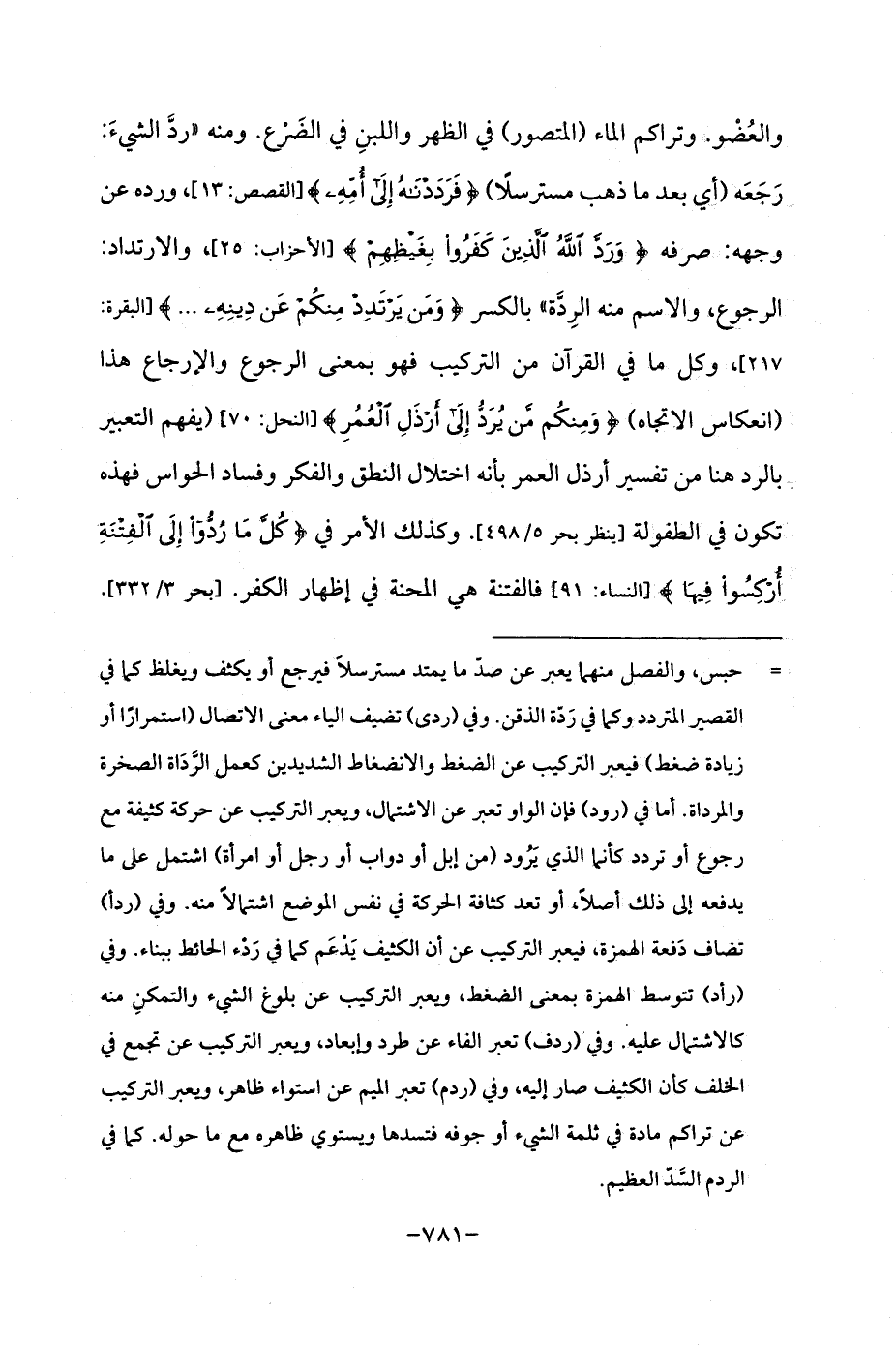 والعُضْو. وتراكم الماء (المتصور) في الظهر واللبنِ في الضَرْع. ومنه "ردَّ الشيءَ: رَجَعَه (أي بعد ما ذهب مسترسلًا) {فَرَدَدْنَاهُ إِلَى أُمِّهِ} [القصص: 13]، ورده عن وجهه: صرفه {وَرَدَّ اللَّهُ الَّذِينَ كَفَرُوا بِغَيْظِهِمْ} [الأحزاب: 25]، والارتداد: الرجوع، والاسم منه الرِدَّة "بالكسر {وَمَنْ يَرْتَدِدْ مِنْكُمْ عَنْ دِينِهِ ...} [البقرة: 217]، وكل ما في القرآن من التركيب فهو بمعنى الرجوع والإرجاع هذا (انعكاس الاتجاه) {وَمِنْكُمْ مَنْ يُرَدُّ إِلَى أَرْذَلِ الْعُمُرِ} [النحل: 70] (يفهم التعبير بالرد هنا من تفسير أرذل العمر بأنه اختلال النطق والفكر وفساد الحواس فهذه تكون في الطفولة [ينظر بحر 5/ 498]. وكذلك الأمر في {كُلَّ مَا رُدُّوا إِلَى الْفِتْنَةِ أُرْكِسُوا فِيهَا} [النساء: 91] فالفتنة هي المحنة في إظهار الكفر. [بحر 3/ 332].