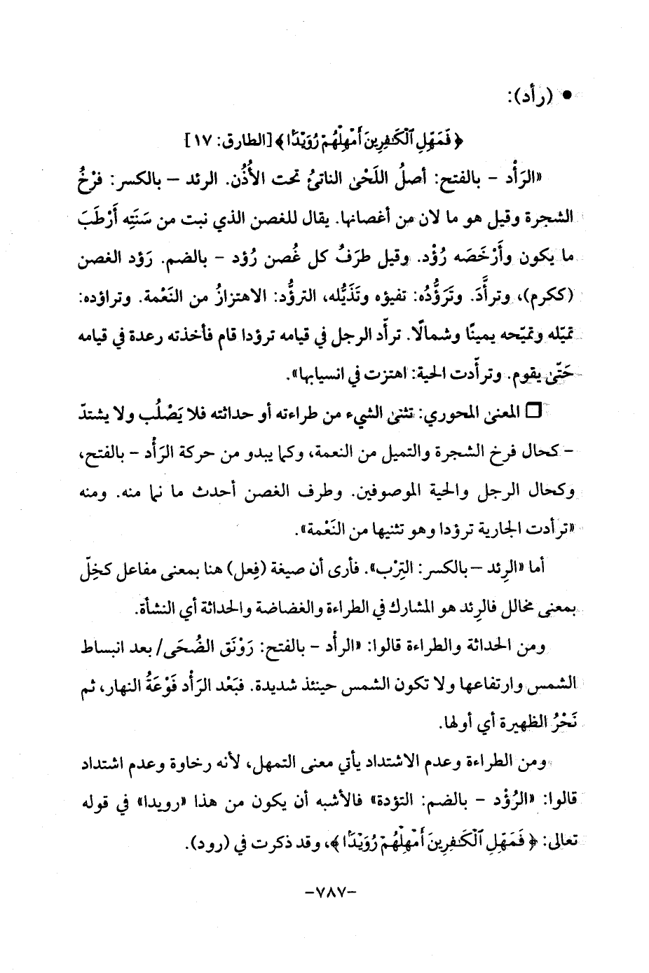 ومن الطراءة وعدم الاشتداد يأتي معنى التمهل، لأنه رخاوة وعدم اشتداد قالوا: "الرُؤْد -بالضم: التؤدة "فالأشبه أن يكون من هذا "رويدا "في قوله تعالى: {فَمَهِّلِ الْكَافِرِينَ أَمْهِلْهُمْ رُوَيْدًا}، وقد ذكرت في (رود).