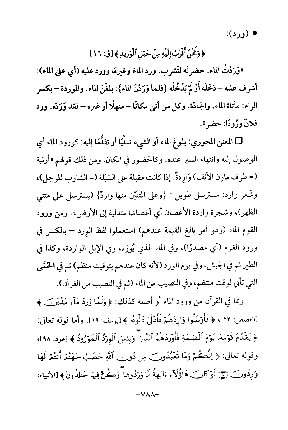"وَرَدْتُ الماء: حضرتَه لتَشرب. ورد الماءَ وغيرهَ، وورد عليه (أي على الماء): أشرف عليه -دَخَلَه أَوْ لَمْ يَدْخُلْه [فلما وَرَدْنَ الماء]: بلغْنَ الماء. والموردة-بكسر الراء: مأتاة الماء، والجادّة. وكل من أتى مكانًا -منهلًا أو غيره- فقد وَرَدَه. ورد فلانٌ ورُودًا: حضر ".