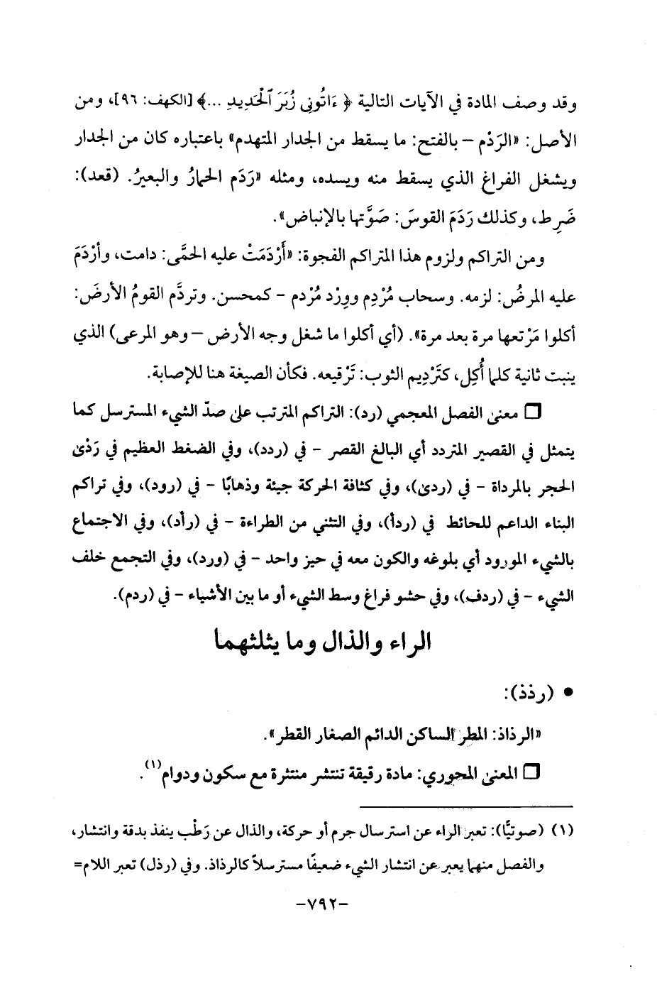 ° معنى الفصل المعجمي (رد): التراكم المترتب على صدّ الشيء المسترسل كما يتمثل في القصير المتردد أي البالغ القصر -في (ردد)، وفي الضغط العظيم في رَدْى الحجر بالمرداة -في (ردى)، وفي كثافة الحركة جيئة وذهابًا -في (رود)، وفي تراكم البناء الداعم للحائط في (ردأ)، وفي التثني من الطراءة -في (رأد)، وفي الاجتماع بالشيء المورود أي بلوغه والكون معه في حيز واحد -في (ورد)، وفي التجمع خلف الشيء -في (ردف)، وفي حشو فراغ وسط الشيء أو ما بين الأشياء -في (ردم).