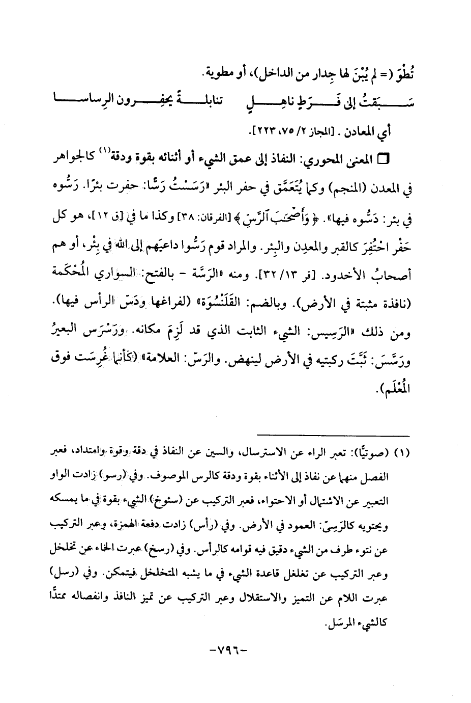 Qالنفاذ إلى عمق الشيء أو أثنائه بقوة ودقة (¬1) كالجواهر في المعدن (المنجم) وكما يُتَعَمَّق في حفر البئر "رَسَسْتُ رَسًّا: حفرت بئرًا. رَسُّوه في بئر: دَسُّوه فيها ". {وَأَصْحَابَ الرَّسِّ} [الفرقان: 38] وكذا ما في [ق 12]، هو كل حَفْر احْتُفِرَ كالقبر والمعدِن والبِئر. والمراد قوم رَسُّوا داعيَهم إلى الله في بِئْر، أو هم أصحابُ الأخدود. [قر 13/ 32]. ومنه "الرَسَّة -بالفتح: السواري المُحْكَمة (نافذة مثبتة في الأرض). وبالضم: القَلَنْسُوَة " (لفراغها ودَسّ الرأس فيها). ومن ذلك "الرَسِيس: الشيء الثابت الذي قد لَزِمَ مكانه. ورَسْرَس البعيرُ ورَسَّسَ: ثَبَّتَ ركبتيه في الأرض لينهض. والرَسّ: العلامة " (كأنما غُرِسَت فوق المُعْلَم).