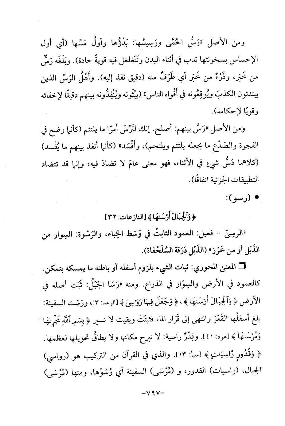 Qثبات الشيء بلزوم أسفله أو باطنه ما يمسكه بتمكن. كالعمود في الأرض والسِوَار في الذراع. ومنه "رَسَا الجَبَلُ: ثَبَت أصله في الأرض {وَالْجِبَالَ أَرْسَاهَا}، {وَجَعَلَ فِيهَا رَوَاسِيَ} [الرعد: 3]، ورَسَت السفينة: بلغ أسفلُها القَعْرَ وانتهى إلى قَرَار الماء فثبتَتْ وبقيت لا تسير {بِسْمِ اللَّهِ مَجْرَاهَا وَمُرْسَاهَا} [هود: 41]. وقِدْرٌ راسية: لا تبرح مكانها ولا يطاقُ تحويلها لعظمها. {وَقُدُورٍ رَاسِيَاتٍ} [سبأ: 13]. والذي في القرآن من التركيب هو (رواسي) الجبال، (راسيات) القدور، و (مُرْسَى) السفينة أي رُسُوّها، ومنها (مُرْسَى)