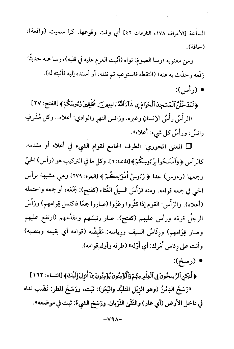 Qالطرف الجامع لقوام الشيء في أعلاه أو مقدمه. كالرأس {وَامْسَحُوا بِرُءُوسِكُمْ} [المائدة: 6]. وكل ما في التركيب هو (رأس) الحيّ وجمعها (رءوس) عدا {رُءُوسُ أَمْوَالِكُمْ} [البقرة: 279] وهي مشبهة برأس الحي في جمعه قوامه. ومنه "رَأَسَ السيلُ الغُثاء (كفتح): جَمَعَه، أو جمعه واحتمله (أعلاه). والرَأْس: القوم إذا كثُروا وعَزّوا (صاروا جمعًا فاكتمل قِوامهم) ورَأَسَ الرجلُ قومَه ورأس عليهم (كفتح): صار رئيسَهم ومقدَّمهم (ارتفع عليهم وصار قِوَامهم) ورِئَاسُ السيف ورِياسه: مَقْبِضُه (قوامه أي يقيمه وينصبه) وأنت على رِئاس أَمْرك: أي أَوّله " (طرفه وأول قوامه).
