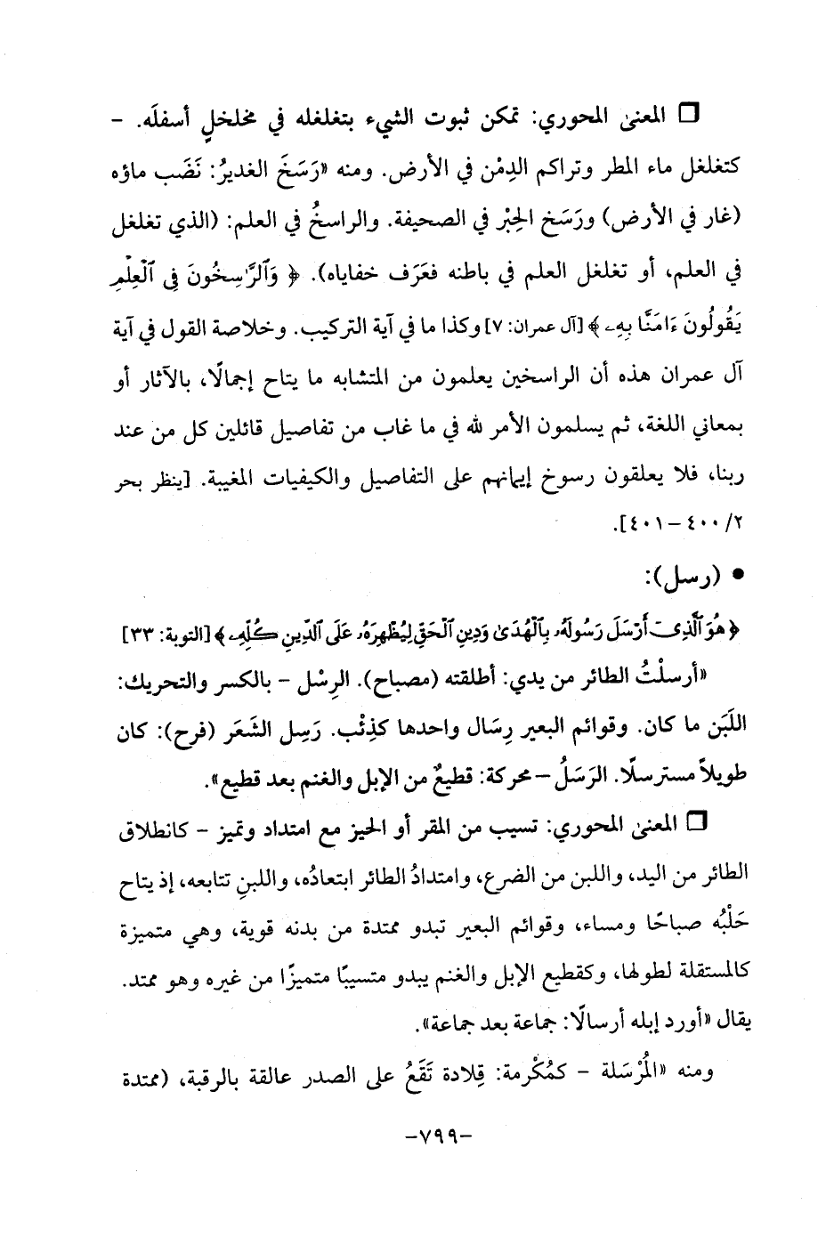 Qتمكن ثبوت الشيء بتغلغله في مخلخلٍ أسفلَه. -كتغلغل ماء المطر وتراكم الدِمْن في الأرض. ومنه "رَسَخَ الغديرُ: نَضَب ماؤه (غار في الأرض) ورَسَخ الحِبْر في الصحيفة. والراسخُ في العلم: (الذي تغلغل في العلم، أو تغلغل العلم في باطنه فعَرَف خفاياه). {وَالرَّاسِخُونَ فِي الْعِلْمِ يَقُولُونَ آمَنَّا بِهِ} [آل عمران: 7] وكذا ما في آية التركيب. وخلاصة القول في آية آل عمران هذه أن الراسخين يعلمون من المتشابه ما يتاح إجمالًا، بالآثار أو بمعاني اللغة، ثم يسلمون الأمر لله في ما غاب من تفاصيل قائلين كل من عند ربنا، فلا يعلقون رسوخ إيمانهم على التفاصيل والكيفيات المغيبة. [ينظر بحر 2/ 400 - 401].