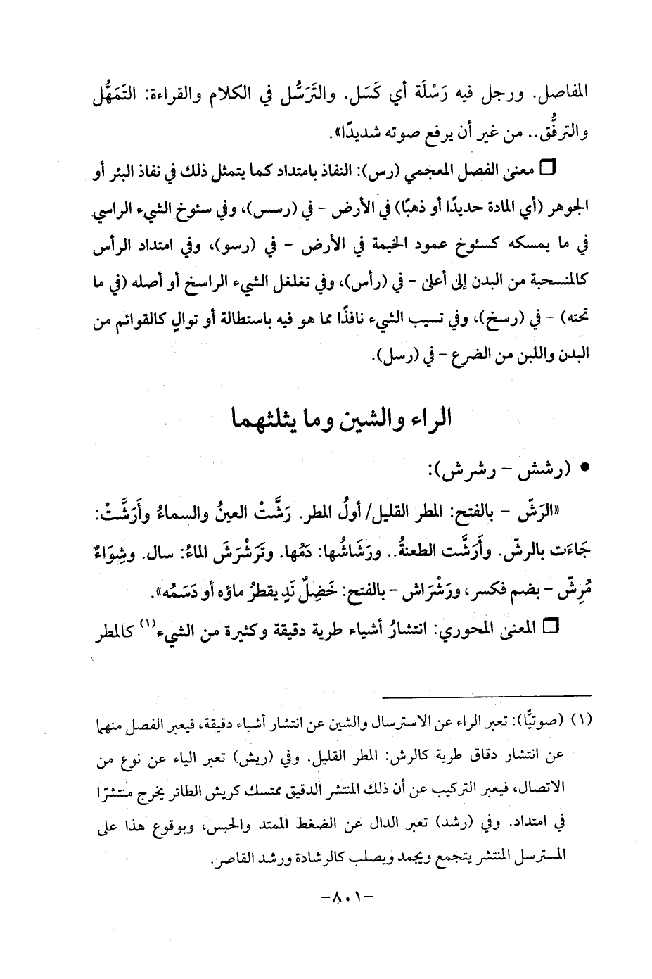 (¬1) (صوتيًّا): تعبر الراء عن الاسترسال والشين عن انتشار أشياء دقيقة، فيعبر الفصل منهما عن انتشار دقاق طرية كالرش: المطر القليل. وفي (ريش) تعبر الياء عن نوع من الاتصال،. فيعبر التركيب عن أن ذلك المنتشر الدقيق ممتسك كريش الطائر يخرج متشرًا في امتداد. وفي (رشد) تعبر الدال عن الضغط الممتد والحبس، وبوقوع هذا على المسترسل المنتشر يتجمع ويجمد ويصلب كالرشادة ورشد القاصر.