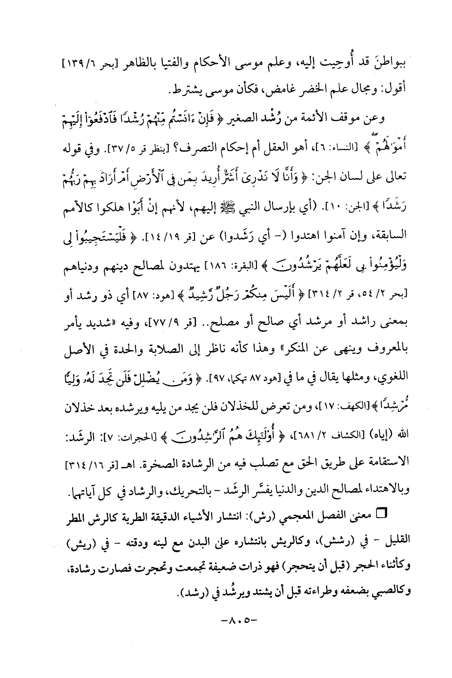 وعن موقف الأئمة من رُشْد الصغير {فَإِنْ آنَسْتُمْ مِنْهُمْ رُشْدًا فَادْفَعُوا إِلَيْهِمْ أَمْوَالَهُمْ} [النساء: 6]، أهو العقل أم إحكام التصرف؟ [ينظر قر 5/ 37]. وفي قوله تعالى على لسان الجن: {وَأَنَّا لَا نَدْرِي أَشَرٌّ أُرِيدَ بِمَنْ فِي الْأَرْضِ أَمْ أَرَادَ بِهِمْ رَبُّهُمْ رَشَدًا} [الجن: 10]. (أي بإرسال النبي - صلى الله عليه وسلم - إليهم، لأنهم إنْ أَبَوْا هلكوا كالأمم السابقة، وإن آمنوا اهتدوا (- أي رَشَدوا) عن [قر 19/ 14]. {فَلْيَسْتَجِيبُوا لِي وَلْيُؤْمِنُوا بِي لَعَلَّهُمْ يَرْشُدُونَ} [البقرة 186] يتهدون لمصالح دينهم ودنياهم [بحر 2/ 54، قر 2/ 314] {أَلَيْسَ مِنْكُمْ رَجُلٌ رَشِيدٌ} [هود: 87] أي ذو رشد أو بمعنى راشد أو مرشد أي صالح أو مصلح .. [قر 9/ 177]، وفيه "شديد يأمر بالمعروف وينهى عن المنكر "وهذا كأنه ناظر إلى الصلابة والحدة في الأصل اللغوي، ومثلها يقال في ما في [هود 87 تهكما، 97]. {وَمَنْ يُضْلِلْ فَلَنْ تَجِدَ لَهُ وَلِيًّا مُرْشِدًا} [الكهف: 17]، ومن تعرض للخذلان فلن مجد من يليه ويرشده بعد خذلان الله (إياه) [الكشاف 2/ 681]، {أُولَئِكَ هُمُ الرَّاشِدُونَ} [الحجرات: 7]: الرشَد: الاستقامة على طريق الحق مع تصلب فيه من الرشادة الصخرة. اهـ[قر 16/ 314] وبالاهتداء لمصالح الدين والدنيا يفسَّر الرشَد -بالتحريك؛ والرشاد في كل آياتهما.