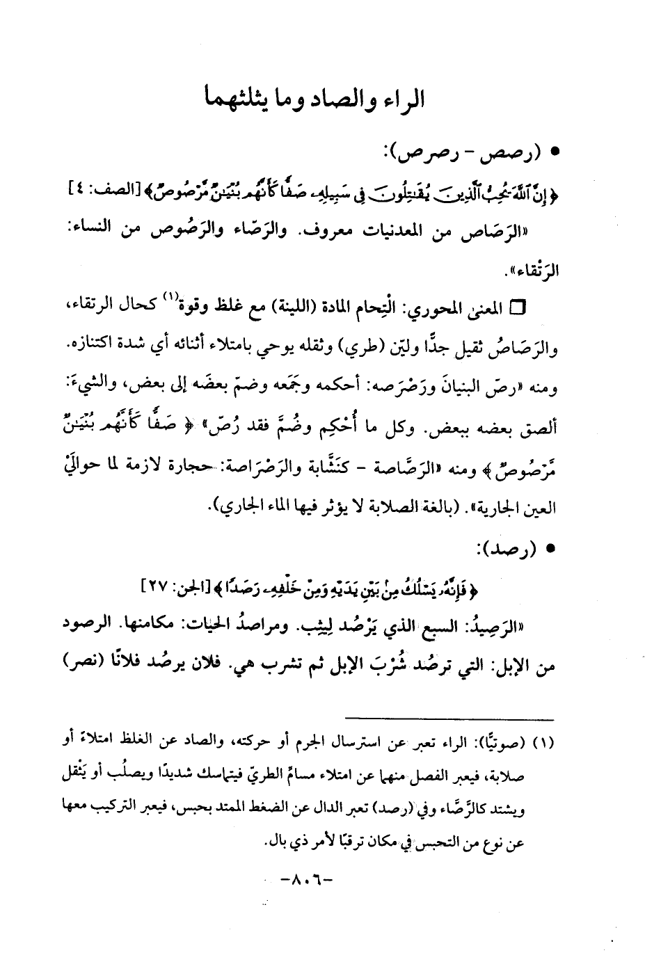 (¬1) (صوتيًّا): الراء تعبر عن استرسال الجرم أو حركته، والصاد عن الغلظ امتلاءً أو صلابة، فيعبر الفصل منهما عن امتلاء مسامِّ -الطريّ فيتماسك شديدًا ويصلُب أو يَثْقل ويشتد كالرَّصَّاء وفي (رصد) تعبر الدال عن الضغط الممتد بحبس، فيعبر التركيب معها عن نوع من التحبس في مكان ترقبّا لأمر ذى بال.