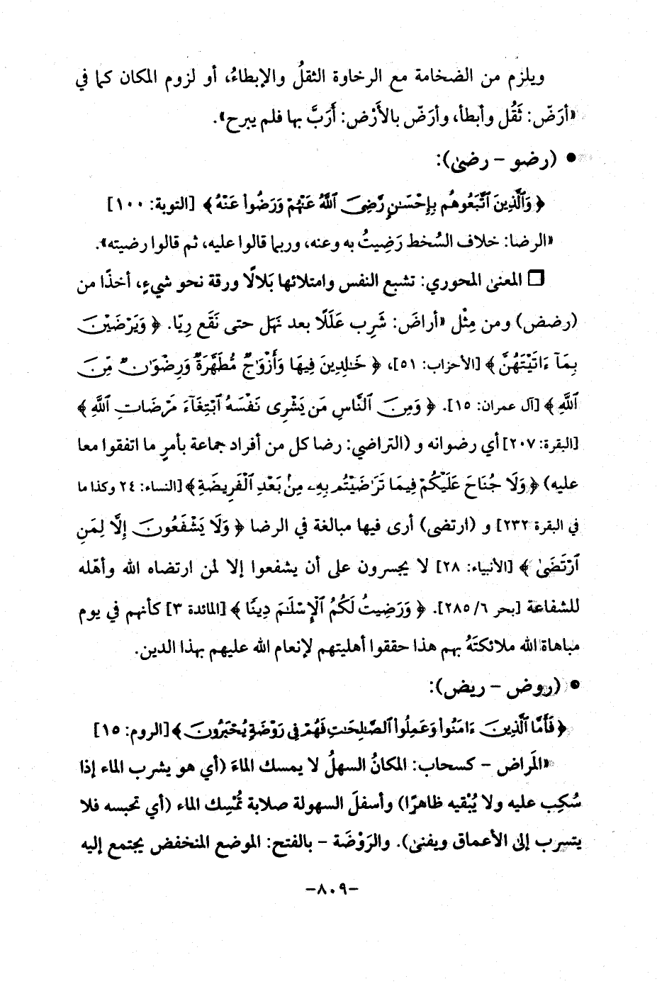 Qتشبع النفس وامتلائها بَلالًا ورقة نحو شيءٍ، أخذًا من (رضض) ومن مِثْل "أراضَ: شرِب عَلَلًا بعد نَهَل حتى نَقَع رِيّا. {وَيَرْضَيْنَ بِمَا آتَيْتَهُنَّ} [الأحزاب: 51]، {خَالِدِينَ فِيهَا وَأَزْوَاجٌ مُطَهَّرَةٌ وَرِضْوَانٌ مِنَ اللَّهِ} [آل عمران: 15]. {وَمِنَ النَّاسِ مَنْ يَشْرِي نَفْسَهُ ابْتِغَاءَ مَرْضَاتِ اللَّهِ} [البقرة: 207] أى رضوانه و (التراضى: رضا كل من أفراد جماعة بأمرٍ ما اتفقوا معا عليه) {وَلَا جُنَاحَ عَلَيْكُمْ فِيمَا تَرَاضَيْتُمْ بِهِ مِنْ بَعْدِ الْفَرِيضَةِ} [النساء: 24] وكذا ما في البقرة 232] و (ارتضى) أرى فيها مبالغة في الرضا {وَلَا يَشْفَعُونَ إِلَّا لِمَنِ ارْتَضَى} [الأنبياء: 28] لا يجسرون على أن يشفعوا إلا لمن ارتضاه الله وأهّله للشفاعة [بحر 6/ 285]. {وَرَضِيتُ لَكُمُ الْإِسْلَامَ دِينًا} [المائدة 3] كانهم في يوم مباهاة الله ملائكتَهُ بهم هذا حققوا أهليتهم لإنعام الله عليهم بهذا الدين.