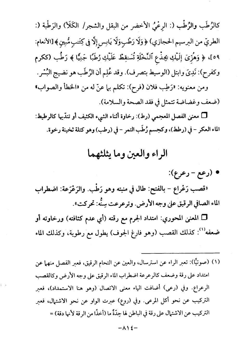 (¬1) (صوتيًّا): تعبر الراء عن استرسال، والعين عن التحام الرقيق، فعبر الفصل منهما عن امتداد على رقة وضعف كالرعرعة اضطراب الماء الرقيق على وجه الأرض وكالقصب الرعراع. وفي (رعى) أضافت الياء معنى الاتصال (وهو هنا الاستمداد)، فعبر التركيب عن نحو أكل المرعى. وفي (روع) عبرت الواو عن نحو الاشتمال، فعبر التركيب عن الاشتمال على رقة في الباطن لها حِدّةٌ ما (أخذًا من الرقة لأنها دقة) =
