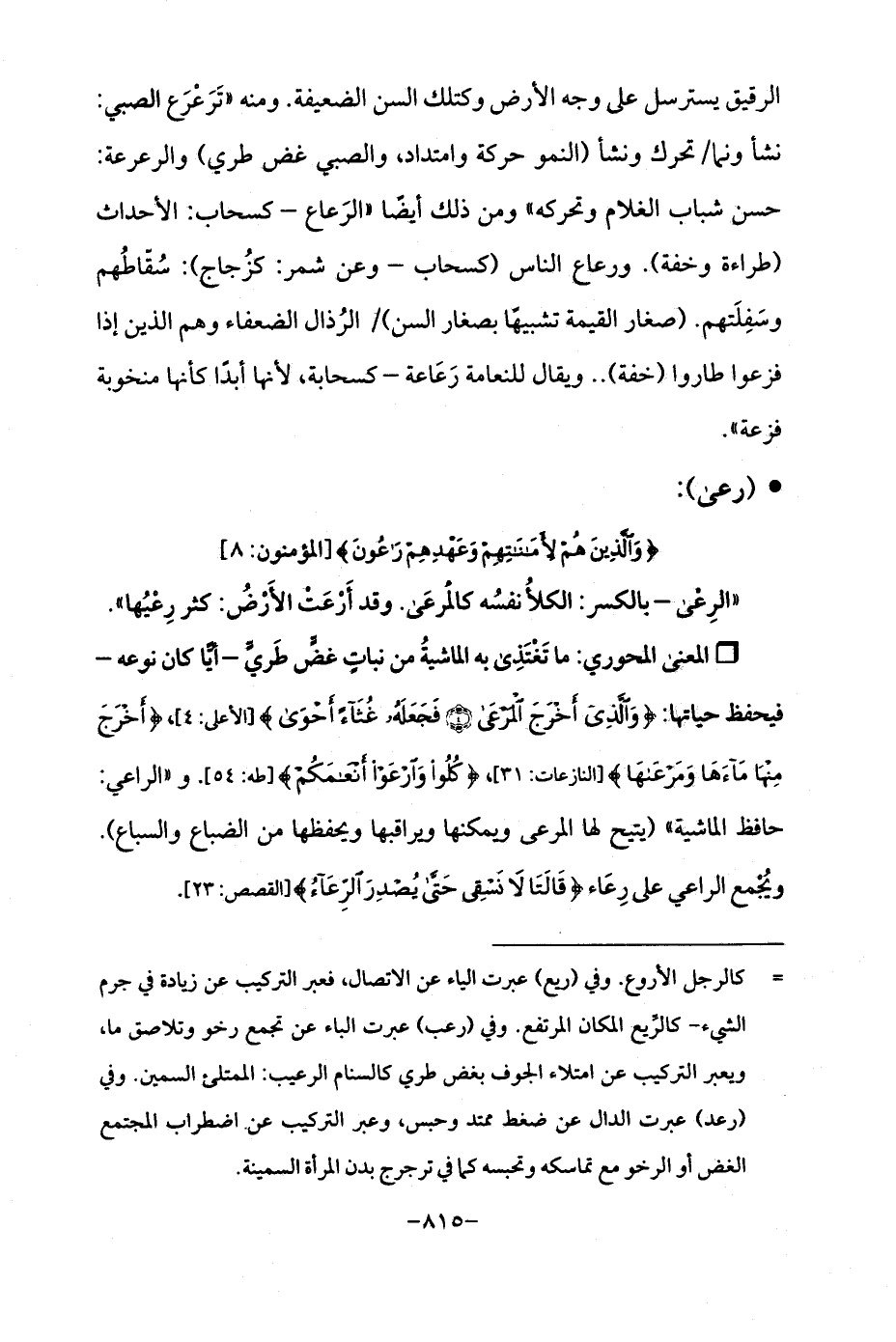 Qما تَغْتَذِى به الماشيةُ من نباتٍ غضٍّ طَريٍّ -أيَّا كان نوعه- فيحفظ حياتها: {وَالَّذِي أَخْرَجَ الْمَرْعَى (4) فَجَعَلَهُ غُثَاءً أَحْوَى} [الأعلى: 4] {أَخْرَجَ مِنْهَا مَاءَهَا وَمَرْعَاهَا} [النازعات: 31]، {كُلُوا وَارْعَوْا أَنْعَامَكُمْ} [طه: 54]. و "الراعي: حافظ الماشية " (يتيح لها المرعى ويمكنها ويراقبها ويحفظها من الضباع والسباع). ويُجْمع الراعي على رِعَاء {قَالَتَا لَا نَسْقِي حَتَّى يُصْدِرَ الرِّعَاءُ} القصص: 23].
