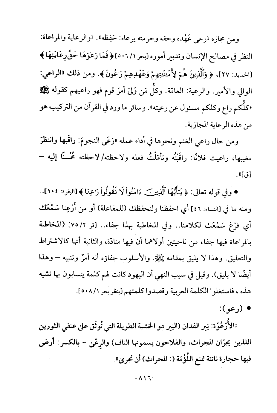 ومن مجازه "رعى عَهْده وحقه وحرمته يرعاه: حَفِظه ". "والرعاية والمراعاة: النظر في مصالح الإنسان وتدبير أموره [بحر 1/ 506] {فَمَا رَعَوْهَا حَقَّ رِعَايَتِهَا} [الحديد: 27]، {وَالَّذِينَ هُمْ لِأَمَانَاتِهِمْ وَعَهْدِهِمْ رَاعُونَ}. ومن ذلك "الراعي: الوالي والأمير. والرعية: العامّة. وكلُّ مَن وَلىَ أمرَ قوم فهو راعيهم كقوله - صلى الله عليه وسلم - "كلُّكم راع وكلكم مسئول عن رعيته ". وسائر ما ورد في القرآن من التركيب هو من هذه الرعاية المجازية.