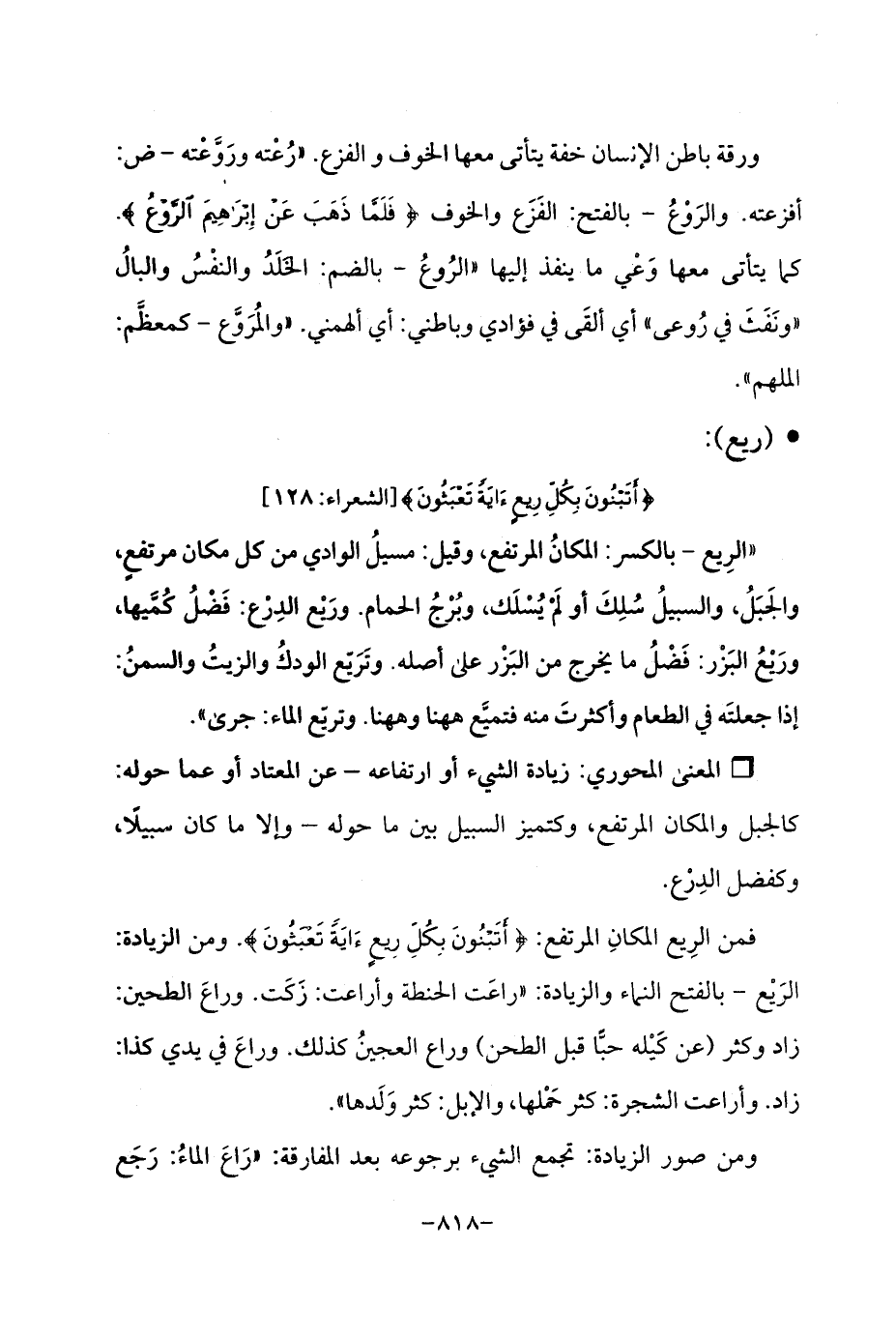فمن الرِيع المكانِ المرتفع: {أَتَبْنُونَ بِكُلِّ رِيعٍ آيَةً تَعْبَثُونَ}. ومن الزيادة: الرَيْع -بالفتح النماء والزيادة: "راعَت الحنطة وأراعت: زَكَت. وراعَ الطحين: زاد وكثر (عن كَيْله حبًّا قبل الطحن) وراع العجينُ كذلك. وراعَ في يدي كذا: زاد. وأراعت الشجرة: كثر حَمْلها، والإبل: كثر وَلَدها ".
