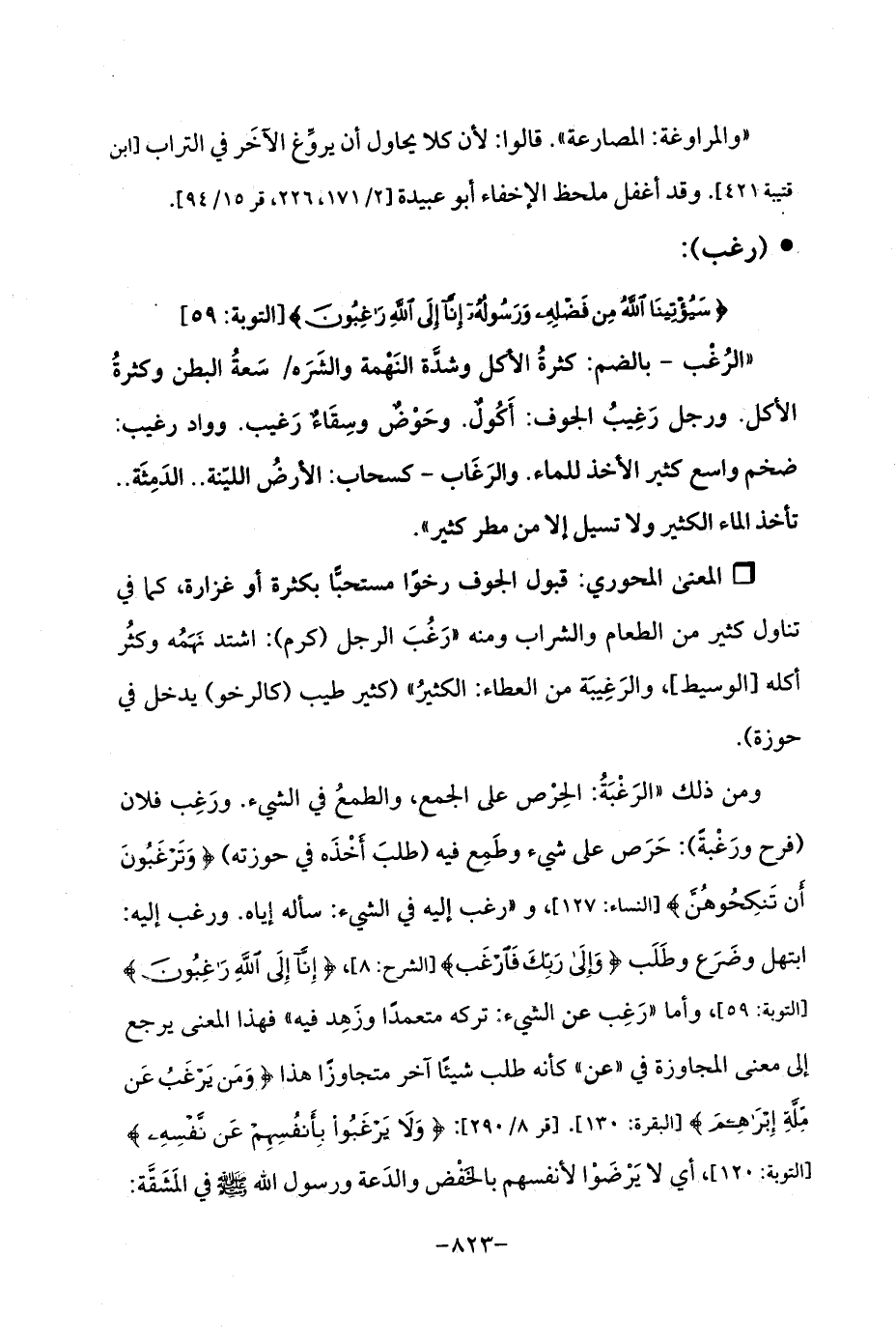 ومن ذلك "الرَغْبَةُ: الحِرْص على الجمع، والطمعُ في الشيء. ورَغِب فلان (فرح ورَغْبةً): حَرَص على شيء وطَمِع فيه (طلبَ أَخْذَه في حوزته) {وَتَرْغَبُونَ أَنْ تَنْكِحُوهُنَّ} [النساء: 127]، و "رغب إليه في الشيء: سأله إياه. ورغب إليه: ابتهل وضَرَع وطَلَب {وَإِلَى رَبِّكَ فَارْغَبْ} [الشرح: 8]، {إِنَّا إِلَى اللَّهِ رَاغِبُونَ} [التوبة: 59]، وأما "رَغِب عن الشيء: تركه متعمدًا وزَهِد فيه "فهذا المعنى يرجع إلى معنى المجاوزة في "عن "كأنه طلب شيئًا آخر متجاوزًا هذا {وَمَنْ يَرْغَبُ عَنْ مِلَّةِ إِبْرَاهِيمَ} [البقرة: 130]. [قر 8/ 290]: {وَلَا يَرْغَبُوا بِأَنْفُسِهِمْ عَنْ نَفْسِهِ} [التوبة: 120]، أي لا يَرْضَوْا لأنفسهم بالخَفْض والدَعة ورسول الله - صلى الله عليه وسلم -في المَشَقَّة: