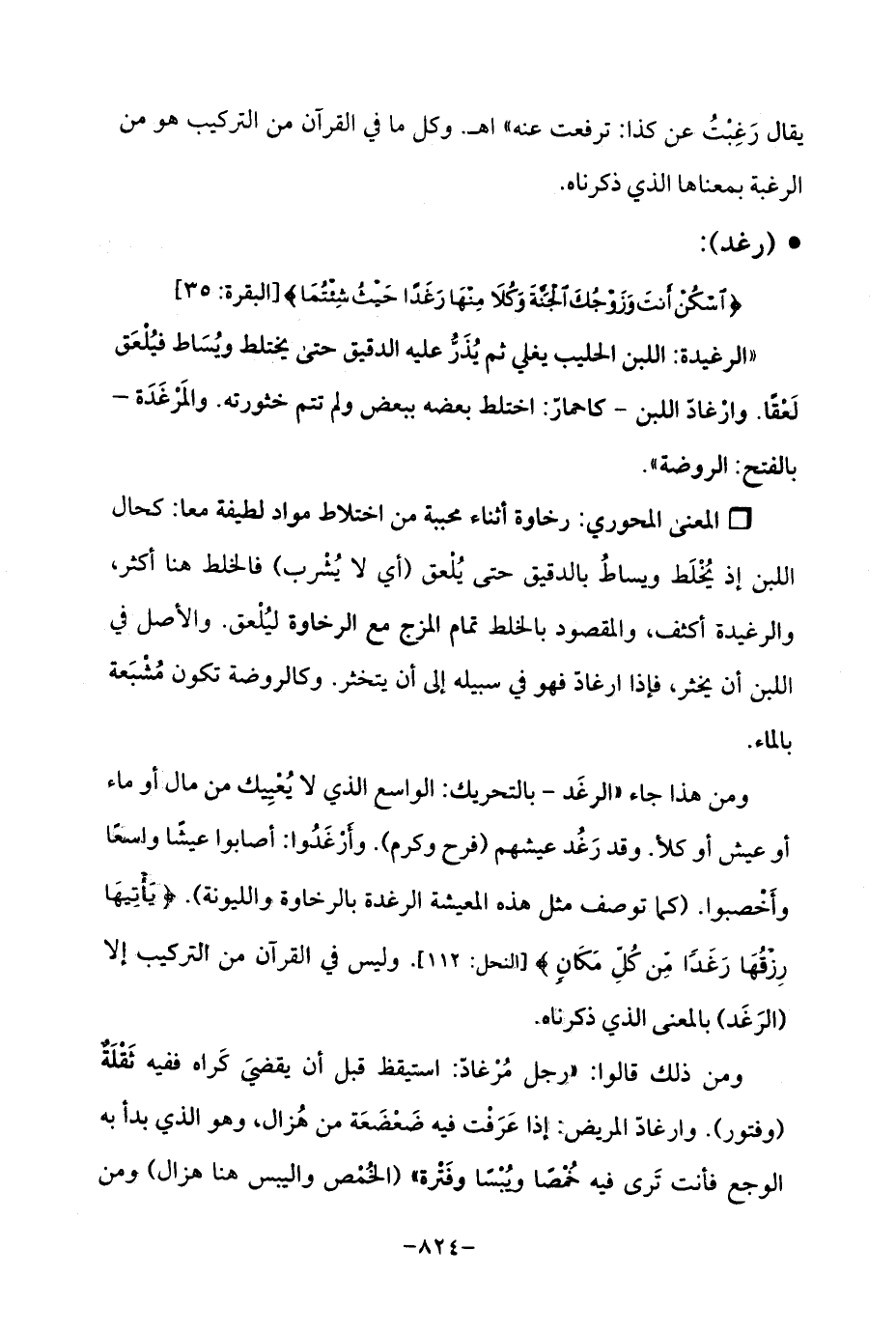 ومن هذا جاء "الرغَد -بالتحريك: الواسع الذي لا يُعْيِيك من مال أو ماء أو عيش أو كلأ. وقد رَغُد عيشهم (فرح وكرم). وأَرْغَدُوا: أصابوا عيشًا واسعًا وأَخْصبوا. (كما توصف مثل هذه المعيشة الرغدة بالرخاوة والليونة). {يَأْتِيهَا رِزْقُهَا رَغَدًا مِنْ كُلِّ مَكَانٍ} [النحل: 112]. وليس في القرآن من التركيب إلا (الرَغَد) بالمعنى الذي ذكرناه.