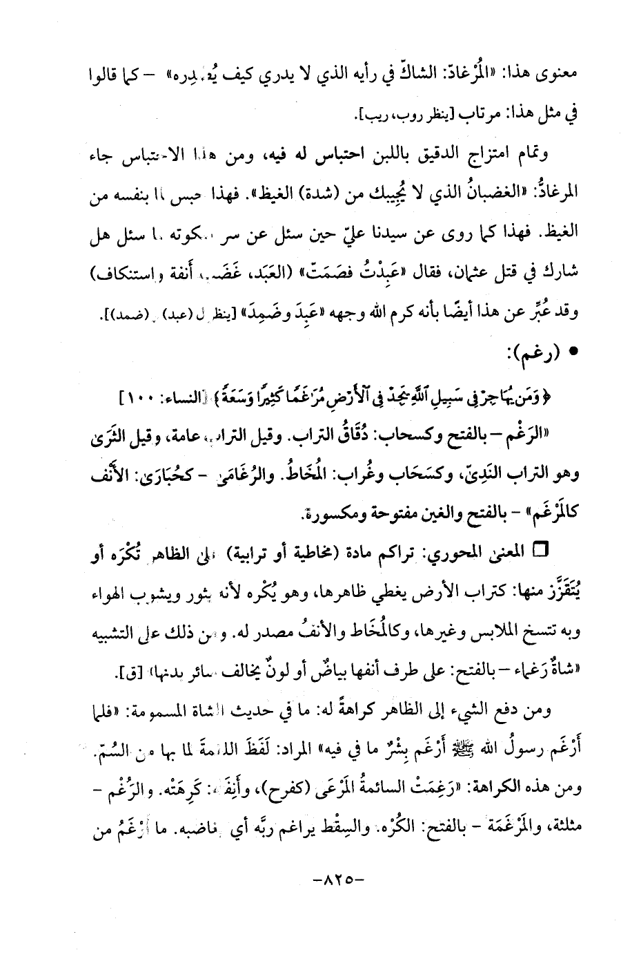 Qتراكم مادة (مخاطية أو ترابية) على الظاهر تُكْرَه أو يُتَقَزَّز منها: كتراب الأرض يغطي ظاهرها، وهو يُكْره لأنه بثور ويشوب الهواء وبه تتسخ الملابس وغيرها، وكالمُخَاط والأنفُ مصدر له. ومن ذلك على التشبيه "شاةٌ رَغماء -بالفتح: على طرف أنفها بياضٌ أو لونٌ يخالف سائر بدنها " [ق]. ومن دفع الشيء إلى الظاهر كراهةً له: ما في حديث الشاة المسمومة: "فلما أَرْغَم رسولُ الله - صلى الله عليه وسلم - أَرْغَم بِشْرٌ ما في فيه "المراد: لَفَظَ اللحمةَ لما بها من السُمّ. ومن هذه الكراهة: "رَغِمَتْ السائمةُ المَرْعَى (كفرح)، وأَنِفَ: كَرِهَتْه. والرَُغْم -مثلثة، والمَرْغَمَة -بالفتح: الكُرْه. والسِقْط يراغم ربَّه أي يغاضبه. ما: أرْغَمُ من