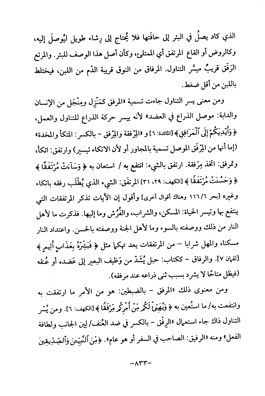 ومن معنى يسر التناول جاءت تسمية "المرفق كمَنْزِل ومِنْجَل من الإنسان والدابة: موصل الذراع في العضد "لأنه ييسر حركة الذراع للتناول والعمل، {وَأَيْدِيَكُمْ إِلَى الْمَرَافِقِ} [المائدة: 6] و "المِرْفقة والمِرْفق -بالكسر: المتكأ والمخدة " (إما أنها من المِرْفَق الموصل تسمية بالمجاور أو لأن الاتكاء تيسير) وارتفق: اتكأ، وتمرفق: اتخذ مِرْفقة. ارتفق بالشيء: انتفع به/ استعان به {وَسَاءَتْ مُرْتَفَقًا} {وَحَسُنَتْ مُرْتَفَقًا} [الكهف: 29، 31] المرتفَق: الشيء الذي يُطْلَب رفقه باتكاء وغيره [بحر 6/ 116 وهناك أقوال أخرى] وأقول إن الآيات تذكر المرتفقات التي ينتفع بها وتيسر الحياة: المسكن، والشراب، والفُرُش وما إليها. فذكرت ما لأهل النار من ذلك ووصفته بالسوء وما لأهل الجنة ووصفته بالحسن. واعتداد النار مسكنا، والمهل شرابا -من المرتفقات يعد تهكما مثل {فَبَشِّرْهُ بِعَذَابٍ أَلِيمٍ} [لقمان 7]. والرفاق -ككتاب: حبل يُشَدّ من وَظيف البعير إلى عَضده أو عُنقه (فيظل متاحًا لا يشرد بسبب ثنى ذراعه عند مرفقه).