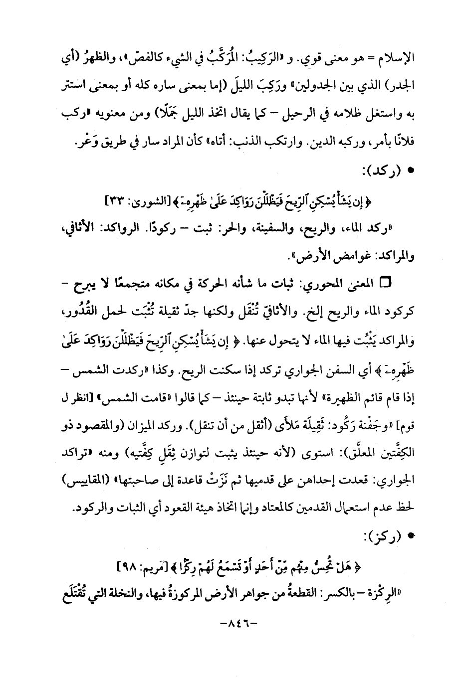 Qثبات ما شأنه الحركة في مكانه متجمعًا لا يبرح -كركود الماء والريح إلخ. والأثافيّ تُنْقَل ولكنها جدّ ثقيلة تُثْبَت لحمل القُدُور، والمراكد يَثْبُت فيها الماء لا يتحول عنها. {إِنْ يَشَأْ يُسْكِنِ الرِّيحَ فَيَظْلَلْنَ رَوَاكِدَ عَلَى ظَهْرِهِ} أي السفن الجواري تركد إذا سكنت الريح. وكذا "ركدت الشمس -إذا قام قائم الظهيرة "لأنها تبدو ثابتة حينئذ -كما قالوا "قامت الشمس " [انظر ل قوم] "وجَفْنة رَكُود: ثَقِيلَة مَلأَى (أثقل من أن تنقل). وركد الميزان (والمقصود ذو الكِفَّتين المعلَّق): استوى (لأنه حينئذ يثبت لتوازن ثِقَلِ كِفَّتيه) ومنه "تراكد الجواري: قعدت إحداهن على قدميها ثم نَزَتْ قاعدة إلى صاحبتها " (المقاييس) لحظ عدم استعمال القدمين كالمعتاد وانما اتخاذ هيئة القعود أي الثبات والركود.