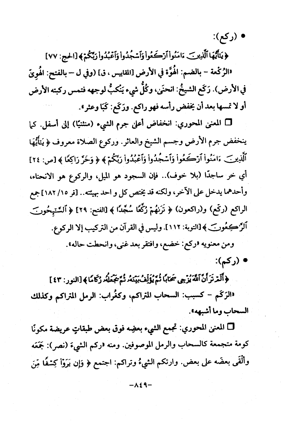 Qانخفاض أعلى جرم الشيء (منثنيًا) إلى أسفل. كما ينخفض جرم الأرض وجسم الشيخ والعاثر. وركوع الصلاة معروف {يَاأَيُّهَا الَّذِينَ آمَنُوا ارْكَعُوا وَاسْجُدُوا وَاعْبُدُوا رَبَّكُمْ} {وَخَرَّ رَاكِعًا} [ص: 24] أي خر ساجدًا (بلا خوف) .. فإن السجود هو الميل، والركوع هو الانحناء، وأحدهما يدخل على الآخر، ولكنه قد يختص كل واحد بهيئته .. [قر 15/ 182] جمع الراكع (ركّع) و (راكعون) {تَرَاهُمْ رُكَّعًا سُجَّدًا} [الفتح: 29] {السَّائِحُونَ الرَّاكِعُونَ} [التوبة: 112]. وليس في القرآن من التركيب إلا الركوع.