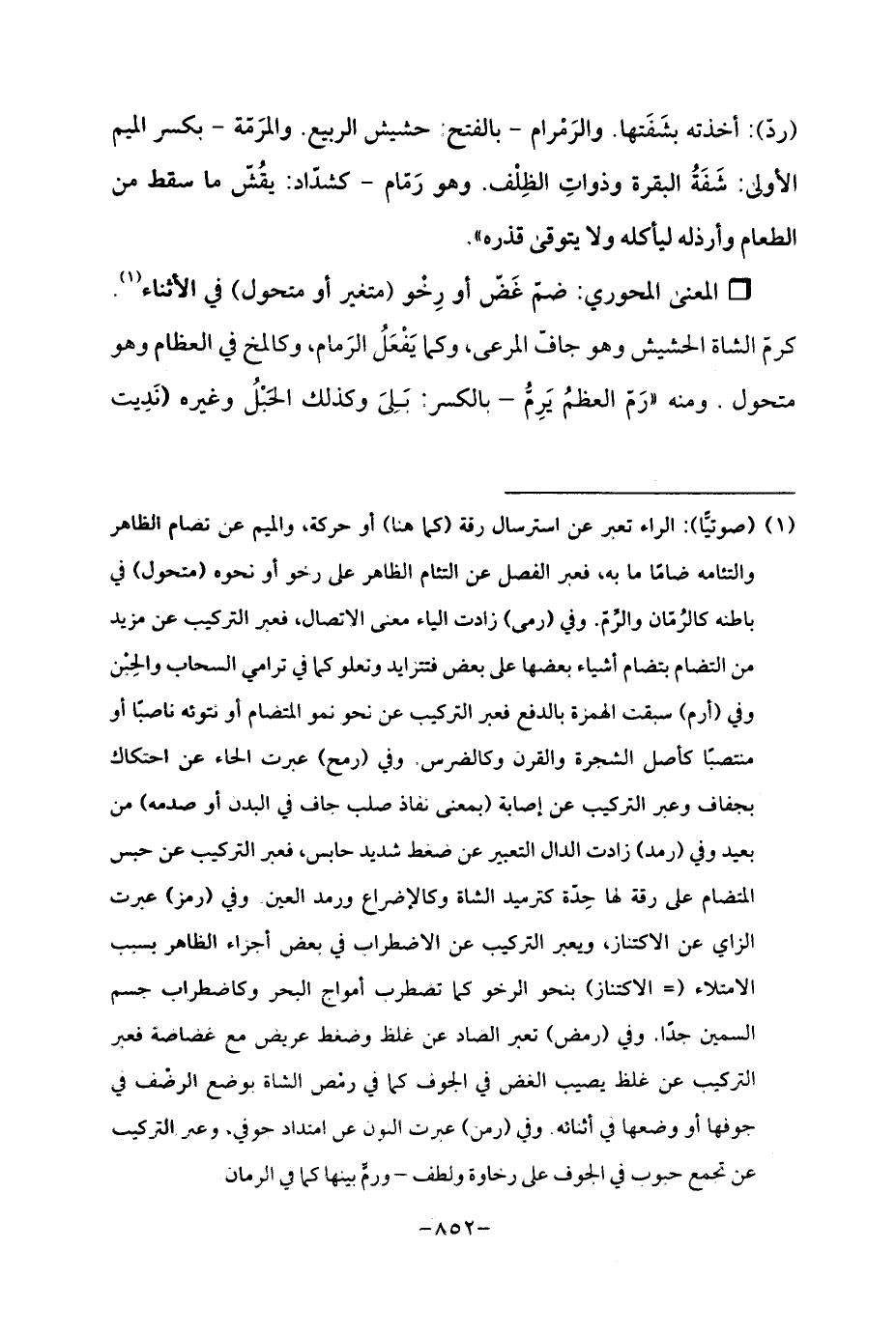 (¬1) (صوتيًّا): الراء تعبر عن استرسال رقة (كما هنا) أو حركة، والميم عن تضام الظاهر والتئامه ضامًا ما به, فعبر الفصل عن التئام الظاهر على رخو أو نحوه (متحول) في باطنه كالرُمّان والرَّمّ. وفي (رمى) زادت الياء معنى الاتصال، فعبر التركيب عن مزيد من التضام بتضام أشياء بعضها على بعض فتتزايد وتعلو كما في ترامي السحاب والحِبْن وفي (أرم) سبقت الهمزة بالدفع فعبر التركيب عن نحو نمو المتضام أو نتوئه ناصبًا أو منتصبًا كأصل الشجرة والقرن وكالضرس. وفي (رمح) عبرت الحاء عن احتكاك بجفاف وعبر التركيب عن إصابة (بمعى نفاذ صلب جاف في البدن أو صدمه) من بعيد وفي (رمد) زادت الدال التعبير عن ضغط شديد حابس، فعبر التركيب عن حبس المتضام على رقة لها حِدّة كترميد الشاة وكالإضراع ورمد العين. وفي (رمز) عبرت الزاي عن الاكتناز، ويعبر التركيب عن الاضطراب في بعض أجزاء الظاهر بسبب الامتلاء (= الاكتناز) بنحو الرخو كما تضطرب أمواج البحر وكاضطراب جسم السمين جدًا. وفي (رمض) تعبر الصاد عن غلظ وضغط عريض مع غضاضة فعبر التركيب عن غلظ يصيب الغض في الجوف كما في رمْص الشاة بوضع الرضْف في جوفها أو وضعها في أثنائه. وفي (رمن) عبرت النون عن امتداد جوفي, وعبر التركيب عن تجمع حبوب في الجوف على رخاوة ولطف - ورمٍّ بينها كما في الرمان