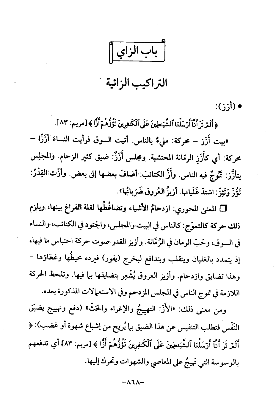 ومن معنى ذلك: "الأَزّ: التهيِيجُ والإغراء والحثّ " (دفع وتهييج يضيّق النَفْس فتطلب التنفيس عن هذا الضيق بما يُريح من إشباع شهوة أو غضب): {أَلَمْ تَرَ أَنَّا أَرْسَلْنَا الشَّيَاطِينَ عَلَى الْكَافِرِينَ تَؤُزُّهُمْ أَزًّا} [مريم: 83] أي تدفعهم بالوسوسة التي تَهيجُ على المعاصي والشهوات وتحرك إليها.