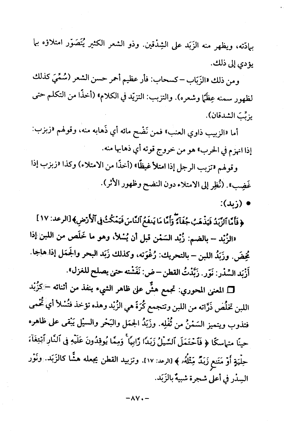 Qتجمع هشٌّ على ظاهر الشيء ينفذ من أثنائه - كزُبْد اللبن تخلُص ذَرَّاته من اللبن وتتجمع كُرَة هي الزُبْد وهذه تؤخذ فتُسْلأ أي تُحْمى فتذوب ويتميز السَمْنُ من ثُفْلِه. وزَبَدُ الجمَل والبَحْر والسيْل يَبْقى على ظاهره حينًا متماسكًا {فَاحْتَمَلَ السَّيْلُ زَبَدًا رَابِيًا وَمِمَّا يُوقِدُونَ عَلَيْهِ فِي النَّارِ ابْتِغَاءَ حِلْيَةٍ أَوْ مَتَاعٍ زَبَدٌ مِثْلُهُ} [الرعد: 17]. وتزبيد القطن يجعله هشًّا كالزَبَد. ونَوْر السِدْر في أعلى شجرة شبيهٌ بالزَبَد.