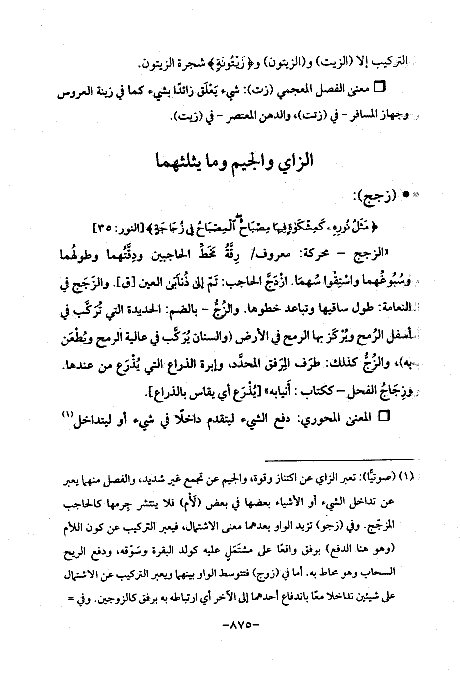 ° معنى الفصل المعجمي (زت): شيء يَعْلَق زائدًا بشيء كما في زينة العروس وجهاز المسافر - في (زتت)، والدهن المعتصر - في (زيت).