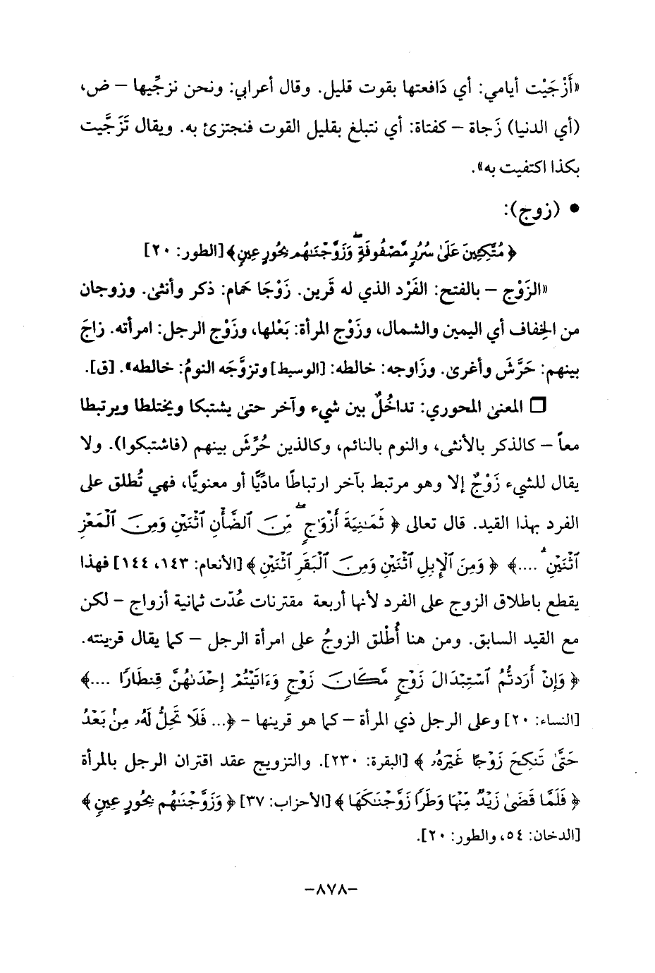 Qتداخُلٌ بين شيء وآخر حتى يشتبكا ويختلطا ويرتبطا معًا - كالذكر بالأنثى، والنوم بالنائم، وكالذين حُرِّشَ بينهم (فاشتبكوا). ولا يقال للشيء زَوْجٌ إلا وهو مرتبط بآخر ارتباطًا مادِّيًّا أو معنويًّا، فهي تُطلق على الفرد بهذا القيد. قال تعالى {ثَمَانِيَةَ أَزْوَاجٍ مِنَ الضَّأْنِ اثْنَيْنِ وَمِنَ الْمَعْزِ اثْنَيْنِ ...} {وَمِنَ الْإِبِلِ اثْنَيْنِ وَمِنَ الْبَقَرِ اثْنَيْنِ} [الأنعام: 143، 144] فهذا يقطع باطلاق الزوج على الفرد لأنها أربعة مقترنات عُدّت ثمانية أزواج - لكن مع القيد السابق. ومن هنا أُطْلق الزوجُ على امرأة الرجل - كما يقال قرينته. {وَإِنْ أَرَدْتُمُ اسْتِبْدَالَ زَوْجٍ مَكَانَ زَوْجٍ وَآتَيْتُمْ إِحْدَاهُنَّ قِنْطَارًا ...} [النساء: 20] وعلى الرجل ذي المرأة - كما هو قرينها - {... فَلَا تَحِلُّ لَهُ مِنْ بَعْدُ حَتَّى تَنْكِحَ زَوْجًا غَيْرَهُ} [البقرة: 230]. والتزويج عقد اقتران الرجل بالمرأة {فَلَمَّا قَضَى زَيْدٌ مِنْهَا وَطَرًا زَوَّجْنَاكَهَا} [الأحزاب: 37] {وَزَوَّجْنَاهُمْ بِحُورٍ عِينٍ} [الدخان: 54، والطور: 20].
