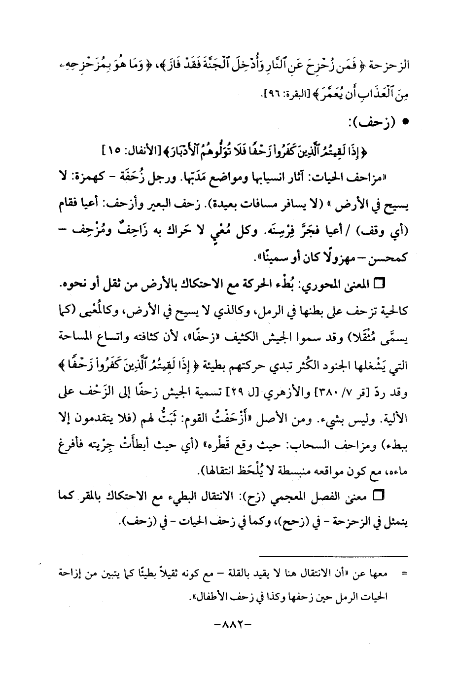 Qبُطْء الحركة مع الاحتكاك بالأرض من ثقل أو نحوه. كالحية تزحف على بطنها في الرمل، وكالذي لا يسيح في الأرض، وكالمُعْيى (كما يسمَّى مُثْقَلا) وقد سموا الجيش الكثيف "زحفًا ", لأن كثافته واتساع المساحة التي يَشْغلها الجنود الكُثر تبدي حركتهم بطيئة {إِذَا لَقِيتُمُ الَّذِينَ كَفَرُوا زَحْفًا} وقد ردّ [قر 7/ 380] والأزهري [ل 29] تسمية الجيش زحفًا إلى الزَحْف على الألية. وليس بشيء. ومن الأصل "أَزْحَفْتُ القوم: ثَبَتُّ لهم (فلا يتقدمون إلا ببطء) ومزاحف السحاب: حيث وقع قَطْره " (أي حيث أبطأَتْ جِرْيته فأفرغ ماءه، مع كون مواقعه منبسطة لا يُلْحَظ انتقالها).