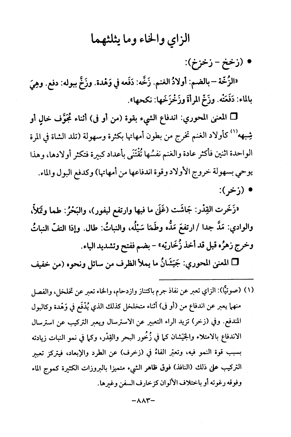(¬1) (صوتيًّا): الزاي تعبر عن نفاذ جرم باكتناز وازدحام، والخاء تعبر عن تخلخل، والفصل منهما يعبر عن اندفاع من (أو في) أنثاء متخلخل كذلك الذي يُدْفَع في وَهْدة وكالبول المندفع. وفي (زخر) تزيد الراء التعبير عن الاسترسال ويعبر التركيب عن استرسال الاندفاع بالامتلاء والجَيَشان كما في زُخُور البحر والقِدْر، وكما في نمو النبات زيادته بسبب قوة النمو فيه، وتعبّر الفاءُ في (زخرف) عن الطرد والإبعاد، فيتركز تعبير التركيب على ذلك (النافذ) فوق ظاهر الشيء متميزا بالبروزات الكثيرة كموج الماء وفوقه رغوته أو باختلاف الألوان كزخارف السفن وغيرها.