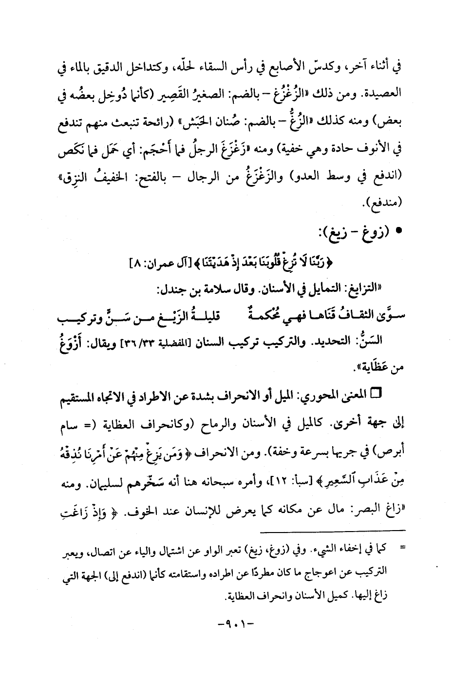 Qالميل أو الانحراف بشدة عن الاطراد فى الاتجاه المستقيم إلى جهة أخرى. كالميل في الأسنان والرماح (وكانحراف العظاية (= سام أبرص) في جريها بسرعة وخفة). ومن الانحراف {وَمَنْ يَزِغْ مِنْهُمْ عَنْ أَمْرِنَا نُذِقْهُ مِنْ عَذَابِ السَّعِيرِ} [سبأ: 12] وأمره سبحانه هنا أنه سَخّرهم لسليمان. ومنه "زاغ البصر: مال عن مكانه كما يعرض للإنسان عند الخوف. {وَإِذْ زَاغَتِ