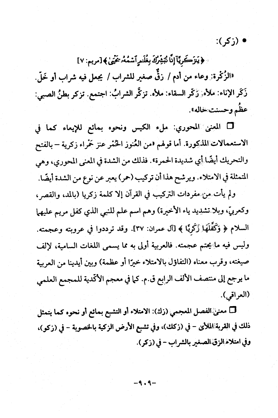ولم يأت من مفردات التركيب في القرآن إلا كلمة زكريا (بالمد، والقصر، وكعربيّ، وبلا تشديد ياء الأخيرة) وهم اسم علم للنبي الذي كفل مريم عليهما السلام {وَكَفَّلَهَا زَكَرِيَّا} [آل عمران: 37]. وقد ترددوا في عروبته وعجمته. وليس فيه ما يحتم عجمته. فالعربية أولى به مما يسمى اللغات السامية، لإلف صيغته، وقرب معناه (التفاؤل بالامتلاء خيرًا أو عظمة) وبين أيدينا من العربية ما يرجع إلى منتصف الألف الرابع ق. م. كما في معجم الأكّدية للمجمع العلمي (العراقي).