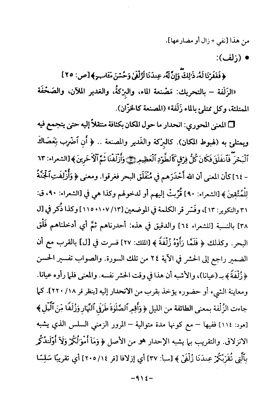 Qانحدار ما حول المكان بكثافة منتقلًا إليه حتى يتجمع فيه ويمتلئ به (لهبوط المكان). كالبِرْكة والغَدير والمصنعة .. {أَنِ اضْرِبْ بِعَصَاكَ الْبَحْرَ فَانْفَلَقَ فَكَانَ كُلُّ فِرْقٍ كَالطَّوْدِ الْعَظِيمِ (63) وَأَزْلَفْنَا ثَمَّ الْآخَرِينَ} [الشعراء: 63, 64] كأن المعنى أن الله أَحْدَرَهم في مُنْفَلَق البحر فغرقوا. ومعنى {وَأُزْلِفَتِ الْجَنَّةُ لِلْمُتَّقِينَ} [الشعراء: 90] قُرِّبتْ إليهم أو لدخولهم وكذا هي في [الشعراء: 90، ق: 31 والتكوير: 13]، وفَسّر قر الكلمة في الموضعين [13/ 107، 115] وكذا ذُكر في [ل 38] بالنسبة [للشعراء 64] والدقيق في هذه: أحدرناهم ثمَّ أي أدخلناهم فَلْق البحر. وكذلك {فَلَمَّا رَأَوْهُ زُلْفَةً} [الملك: 27] فسرت في [ل] بالقرب مع أن الضمير راجع إلى الحشر في الآية 24 من تلك السورة. والصواب تفسير الحسن {زُلْفَةً} بـ (عيانا)، والأشبه أن هذا في وقت الحشر نفسه. والمعنى فلما رأوه عيانا. ومعاينة الشيء أو حضوره يؤخذ بقرب من الانحدار إليه [ينظر قر 18/ 220]. كما جاءت الزُلْفة بمعنى الطائفة من الليل {وَأَقِمِ الصَّلَاةَ طَرَفَيِ النَّهَارِ وَزُلَفًا مِنَ اللَّيْلِ} [هود: 114] ففيها - مع كونها مدة متوالية - المرور الزمني السلس الذي يشبه الانزلاق. والتقريب بما يشبه الإحدار هو من الأصل {وَمَا أَمْوَالُكُمْ وَلَا أَوْلَادُكُمْ بِالَّتِي تُقَرِّبُكُمْ عِنْدَنَا زُلْفَى} [سبأ: 37] أي إزلافا [قر 14/ 205] أي تقريبًا سَلِسًا