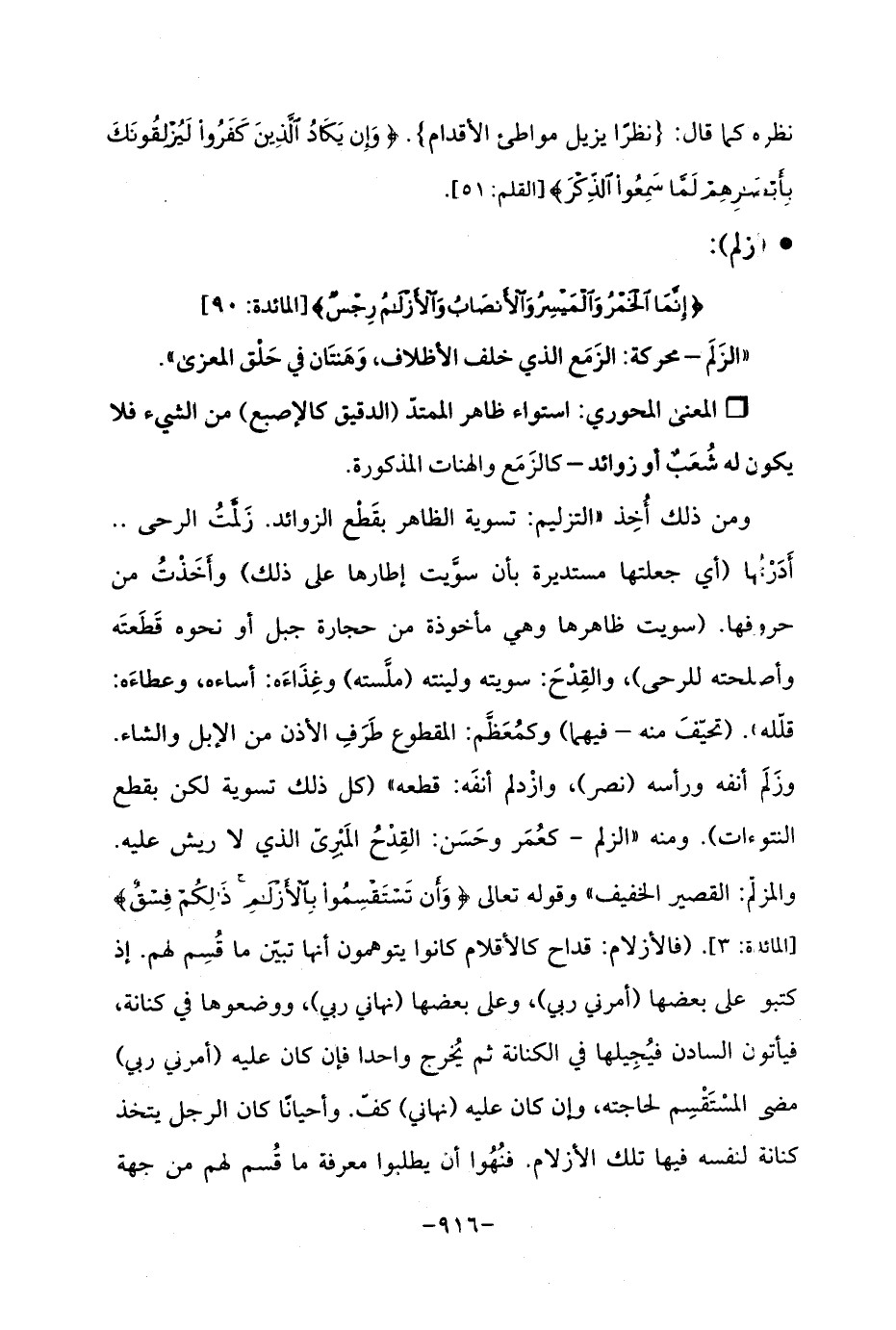 ومن ذلك أُخِذ "التزليم: تسوية الظاهر بقَطْع الزوائد. زَلَّمتُ الرحى .. أدَرْتُها (أي جعلتها مستديرة بأن سوَّيت إطارها على ذلك) وأخَذْتُ من حروفها. (سويت ظاهرها وهي مأخوذة من حجارة جبل أو نحوه قَطَعتَه وأصلحته للرحى)، والقِدْحَ: سويته ولينته (ملَّسته) وغِذَاءَه: أساءه، وعطاءَه: قلّله). (تحيّفَ منه - فيهما) وكمُعَظَّم: المقطوع طَرَفِ الأذن من الإبل والشاء. وزَلَم أنفه ورأسه (نصر)، وازْدلم أنفَه: قطعه " (كل ذلك تسوية لكن بقطع النتوءات). ومنه "الزلم - كعُمَر وحَسَن: القِدْحُ المَبْرِىّ الذي لا ريش عليه. والمزلّم: القصير الخفيف "وقوله تعالى {وَأَنْ تَسْتَقْسِمُوا بِالْأَزْلَامِ ذَلِكُمْ فِسْقٌ} [المائدة: 3]. (فالأزلام: قداح كالأقلام كانوا يتوهمون أنها تبيّن ما قُسِم لهم. إذ كتبو على بعضها (أمرني ربي)، وعلى بعضها (نهاني ربي)، ووضعوها في كنانة، فيأتون السادن فيُجِيلها في الكنانة ثم يُخرج واحدا فإن كان عليه (أمرني ربي) مضى المسْتَقْسِم لحاجته، وإن كان عليه (نهاني) كفّ. وأحيانًا كان الرجل يتخذ كنانة لنفسه فيها تلك الأزلام. فنُهُوا أن يطلبوا معرفة ما قُسم لهم من جهة