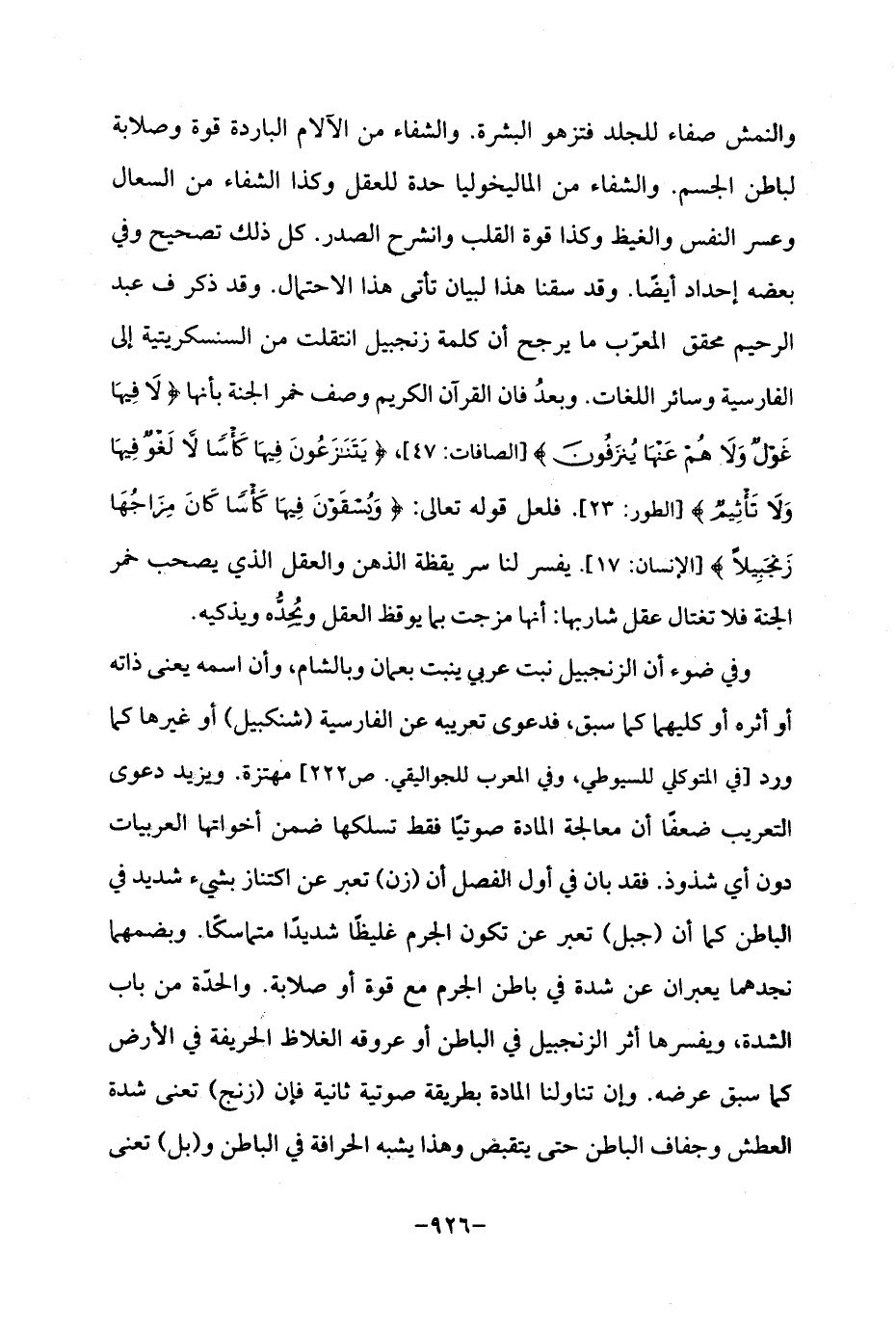 والنمش صفاء للجلد فتزهو البشرة. والشفاء من الآلام الباردة قوة وصلابة لباطن الجسم. والشفاء من الماليخوليا حدة للعقل وكذا الشفاء من السعال وعسر النفس والغيظ وكذا قوة القلب وانشرح الصدر. كل ذلك تصحيح وفي بعضه إحداد أيضًا. وقد سقنا هذا لبيان تأتى هذا الاحتمال. وقد ذكر ف عبد الرحيم محقق المعرّب ما يرجح أن كلمة زنجبيل انتقلت من السنسكريتية إلى الفارسية وسائر اللغات. وبعدُ فإن القرآن الكريم وصف خمر الجنة بأنها {لَا فِيهَا غَوْلٌ وَلَا هُمْ عَنْهَا يُنْزَفُونَ} [الصافات: 47]، {يَتَنَازَعُونَ فِيهَا كَأْسًا لَا لَغْوٌ فِيهَا وَلَا تَأْثِيمٌ} [الطور: 23]. فلعل قوله تعالى: {وَيُسْقَوْنَ فِيهَا كَأْسًا كَانَ مِزَاجُهَا زَنْجَبِيلًا} [الإنسان: 17]. يفسر لنا سر يقظة الذهن والعقل الذي يصحب خمر الجنة فلا تغتال عقل شاربها: أنها مزجت بما يوقظ العقل ويُحِدُّه ويذكيه.
