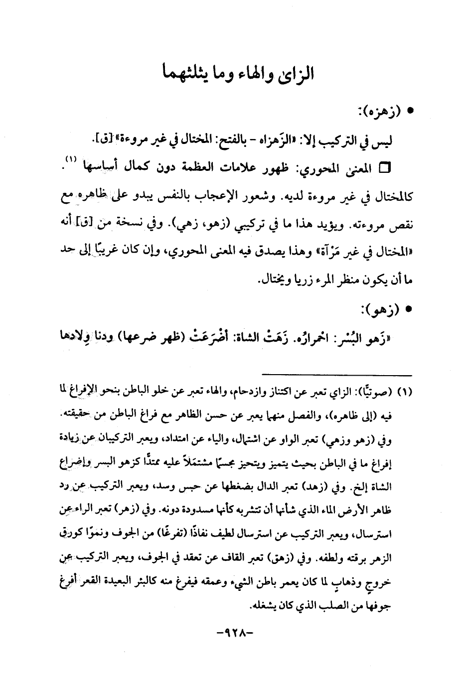 (¬1) (صوتيًّا): الزاي تعبر عن اكتناز وازدحام، والهاء تعبر عن خلو الباطن بنحو الإفراغ لما فيه (إلى ظاهره)، والفصل منهما يعبر عن حسن الظاهر مع فراغ الباطن من حقيقته. وفي (زهو وزهي) تعبر الواو عن اشتمال، والياء عن امتداد، ويعبر التركيبان عن زيادة إفراغ ما في الباطن بحيث يتميز ويتحيز مجسمًا مشتمَلاً عليه ممتدًّا كزهو البسر وإضراع الشاة إلخ. وفي (زهد) تعبر الدال بضغطها عن حبس وسد، ويعبر التركيب عن رد ظاهر الأرض الماء الذي شأنها أن تتشربه كأنها مسدودة دونه. وفي (زهر) تعبر الراء عن استرسال، ويعبر التركيب عن استرسال لطيف نفاذًا (تفرغًا) من الجوف ونموًا كورق الزهر برقته ولطفه. وفي (زهق) تعبر القاف عن تعقد في الجوف، ويعبر التركيب عن خروجٍ وذهابٍ لما كان يعمر باطن الشيء وعمقه فيفرغ منه كالبئر البعيدة القعر أفرغ جوفها من الصلب الذي كان يشغله.