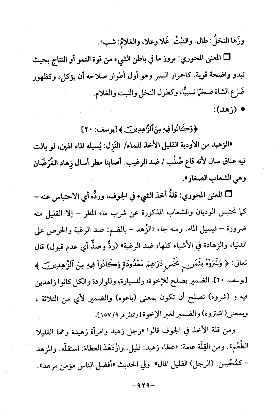 Qقلةُ أخذ الشيء في الجوف، وردُّه أي الاحتباس عنه - كما تحتبس الوديان والشعاب المذكورة عن شرب ماء المطر - إلا القليل منه ضرورة - فيسيل الماء. ومنه جاء "الزُهد - بالضم: ضد الرغبة والحرص على الدنيا، والزهادة في الأشياء كلها، ضد الرغبة " (ردٌّ وصدٌّ أي عدم قبول) قال تعالى: {وَشَرَوْهُ بِثَمَنٍ بَخْسٍ دَرَاهِمَ مَعْدُودَةٍ وَكَانُوا فِيهِ مِنَ الزَّاهِدِينَ} [يوسف: 20]. الضمير يصلح للإخوة، وللسيارة، وللواردة والكل كانوا زاهدين فيه و (شروه) تصلح أن تكون بمعنى (باعوه) والضمير لأي من الثلاثة، وبمعنى (اشتروه) والضمير لغير الإخوة [وانظر قر 9/ 157].