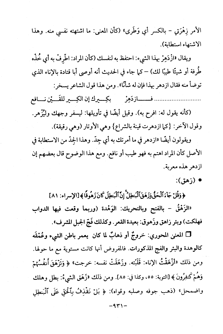 Qخروجٌ أو ذهابٌ لما كان يعمر باطن الشيء وعُمْقَه كالوهدة والبئر والفج المذكورات. فالمفروض أنها كانت مستوية مع ما حولها. ومن ذلك "أزْهَقْتُ الإناء: قَلَبْته. وزَهَقَتْ نفسه: خرجت " {وَتَزْهَقَ أَنْفُسُهُمْ وَهُمْ كَافِرُونَ} [التوبة: 55, وكذا في: 85]. ومن ذلك "زَهَق الشيءُ: بطل وهلك واضمحل " (ذهب جوفه وصلبه وقواه): {بَلْ نَقْذِفُ بِالْحَقِّ عَلَى الْبَاطِلِ