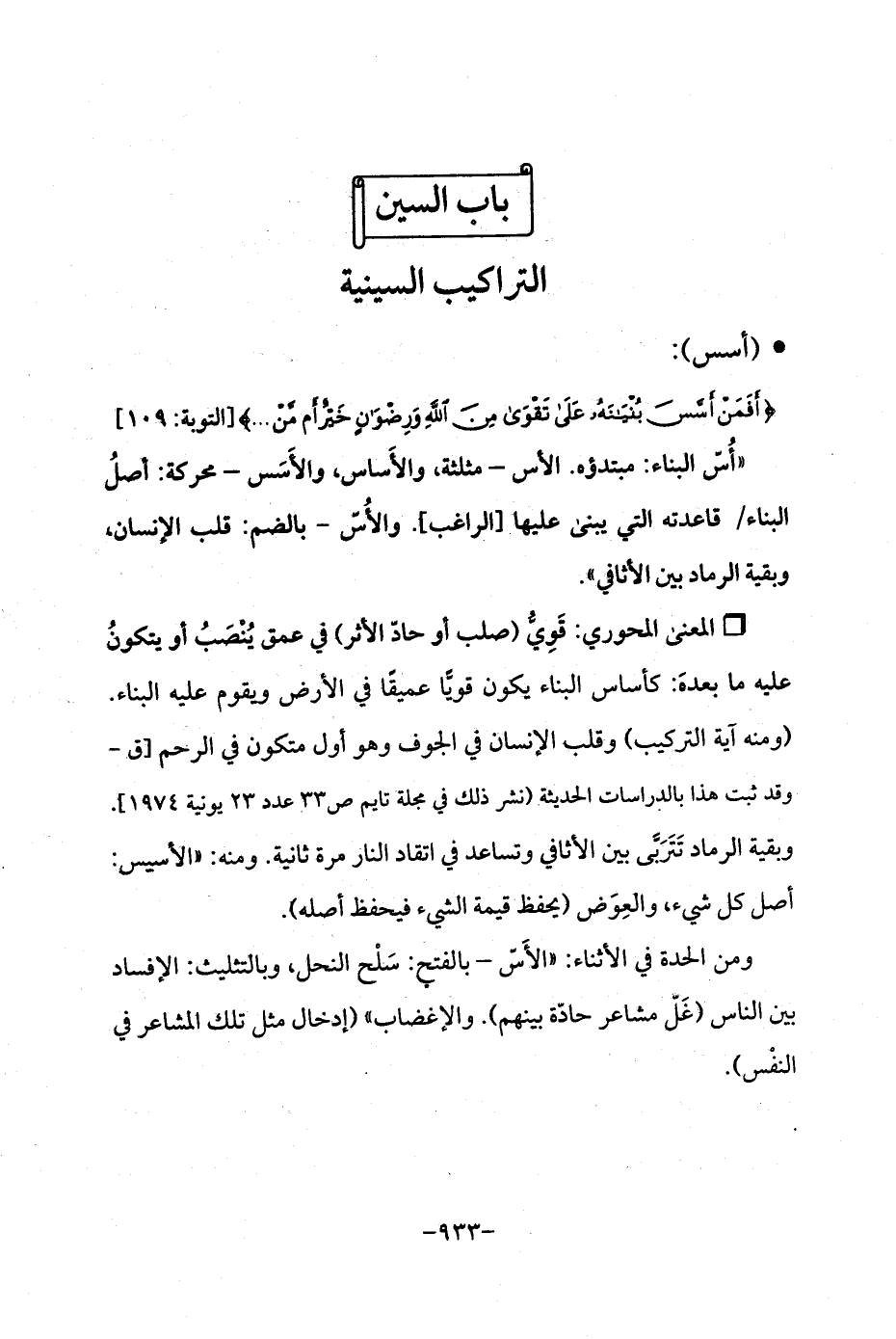 Qقَوِيُّ (صلب أو حادّ الأثر) في عمق يُنْصَبُ أو يتكونُ عليه ما بعده: كأساس البناء يكون قويًّا عميقًا في الأرض ويقوم عليه البناء. (ومنه آية التركيب) وقلب الإنسان في الجوف وهو أول متكون في الرحم [ق - وقد ثبت هذا بالدراسات الحديثة (نشر ذلك في مجلة تايم ص 33 عدد 23 يونية 1974]. وبقية الرماد تَتَرَبَّى بين الأثافي وتساعد في اتقاد النار مرة ثانية. ومنه: "الأسيس: أصل كل شيء، والعِوَض (يحفظ قيمة الشيء فيحفظ أصله).