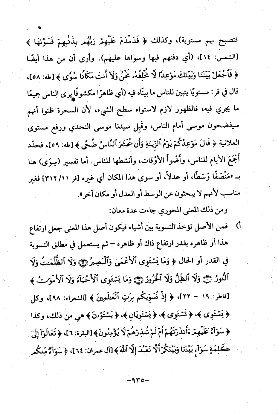 أ) فمن الأصل تؤخذ التسوية بين أشياء فيكون أصل هذا المعنى جعل ارتفاع هذا أو ظاهره بقدر ارتفاع ذاك أو ظاهره - ثم يستعمل في مطلق التسوية في القدر أو الحال {وَمَا يَسْتَوِي الْأَعْمَى وَالْبَصِيرُ (19) وَلَا الظُّلُمَاتُ وَلَا النُّورُ (20) وَلَا الظِّلُّ وَلَا الْحَرُورُ (21) وَمَا يَسْتَوِي الْأَحْيَاءُ وَلَا الْأَمْوَاتُ} [فاطر: 19 - 22]، {إِذْ نُسَوِّيكُمْ بِرَبِّ الْعَالَمِينَ} [الشعراء: 98]، وكل {يَسْتَوِي}، {تَسْتَوِي}، {يَسْتَوِيَانِ} , {يَسْتَوُونَ} هي من ذلك، وكذا {سَوَاءٌ عَلَيْهِمْ أَأَنْذَرْتَهُمْ أَمْ لَمْ تُنْذِرْهُمْ لَا يُؤْمِنُونَ} [البقرة: 6]، {تَعَالَوْا إِلَى كَلِمَةٍ سَوَاءٍ بَيْنَنَا وَبَيْنَكُمْ أَلَّا نَعْبُدَ إِلَّا اللَّهَ} [آل عمران: 64] , {سَوَاءٌ مِنْكُمْ