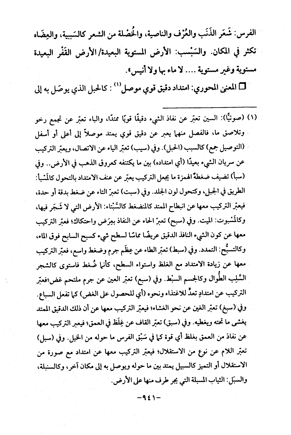 (¬1) (صوتيًّا): السين تعبّر عن نفاذ الشيء دقيقًا قويًا ممتدًا، والباء تعبّر عن تجمع رخو وتلاصق ما، فالفصل منهما يعبر عن دقيق قوي يمتد موصلًا إلى أعلى أو أسفل (التوصيل جمع) كالسبب (الحبل). وفي (سيب) تعبّر الياء عن الاتصال، ويعبّر التركيب عن سريان الشيء بعيدًا (أي امتداده) بين ما يكتنفه كعروق الذهب في الأرض .. وفي (سبأ) تضيف ضغطه الهمزة ما يجعل التركيب يعبّر عن عنف الامتداد بالتحول كالمَسْبأ: الطريق في الجبل، وكتحول لون الجلد. وفي (سبت) تعبّر التاء عن ضغط بدقة أو حدة، فيعبّر التركيب معها عن انبطاح الممتد كالمنضغط كالسَّبْتاء: الأرض التي لا شَجَر فيها، وكالمَسْبوت: الميت. وفي (سبح) تعبّر الحاء عن النفاذ بعِرَض واحتكاك؛ فعبّر التركيب معها عن كون الشيء النافذ الدقيق عريضًا مماسًا لسطح شيء كسبح السابح فوق الماء، وكالتسبُّح: التمدد. وفي (سبط) تعبّر الطاء عن عِظَم جرم وضغط واسع، فعبّر التركيب معها عن زيادة الامتداد مع الغلظ واستواء السطح، كأنما ضُغط فاستوى كالشجر السَّلِب الطُّوال وكالجسم السبْط. وفي (سبع) تعبّر العين عن جرم ملتحم غض؛ فعبّر التركيب عن امتدادِ تعدٍّ للاغتذاء ونحوه (أي للحصول عل الغض) كما تفعل السباع. وفي (سبغ) تعبّر الغين عن نحو الغشاء؛ فيعبّر التركيب معها عن أن ذلك الدقيق الممتد يغشى ما تحته ويغطيه. وفي (سبق) تعبّر القاف عن غِلَظ في العمق؛ فيعبر التركيب معها عن نفاذ من العمق بغلظ أي قوة كما في سَبْق الفرس ما حوله من الخيل. وفي (سبل) تعبّر اللام عن نوع من الاستقلال؛ فيعبّر التركيب معها عن امتداد مع صورة من الاستقلال أو التميز كالسبيل يمتد بين ما حوله ويوصل به إلى مكان آخر، وكالسنبلة، والسبَل: الثياب المسبلة التي يجر طرف منها على الأرض.
