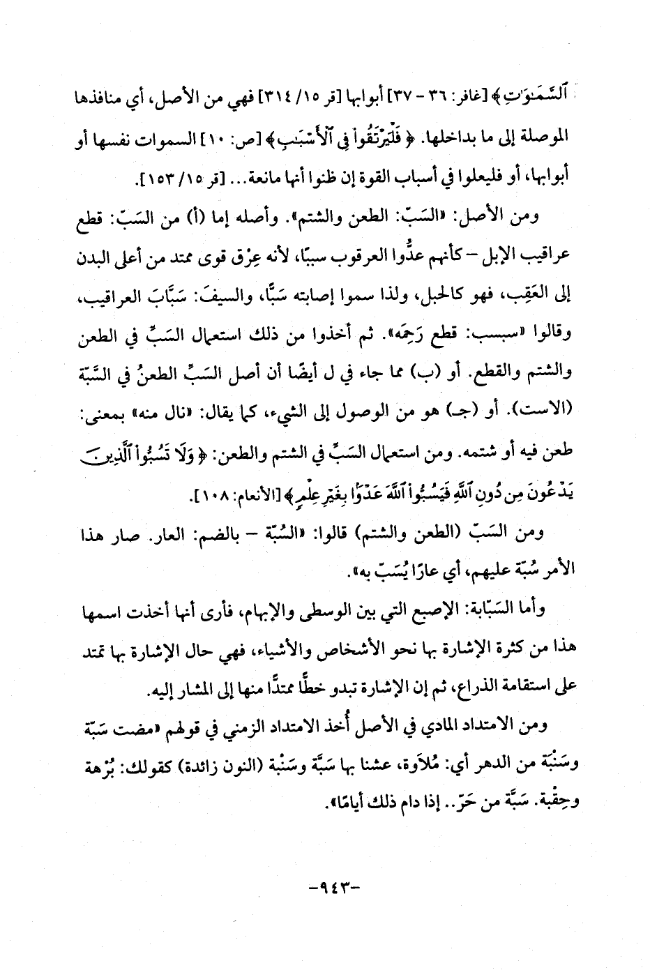 السَّمَاوَاتِ} [غافر: 36, 37] أبوابها [قر 15/ 314] فهي من الأصل، أي منافذها الموصلة إلى ما بداخلها. {فَلْيَرْتَقُوا فِي الْأَسْبَابِ} [ص: 10] السموات نفسها أو أبوابها، أو فليعلوا في أسباب القوة إن ظنوا أنها مانعة ... [قر 15/ 153].